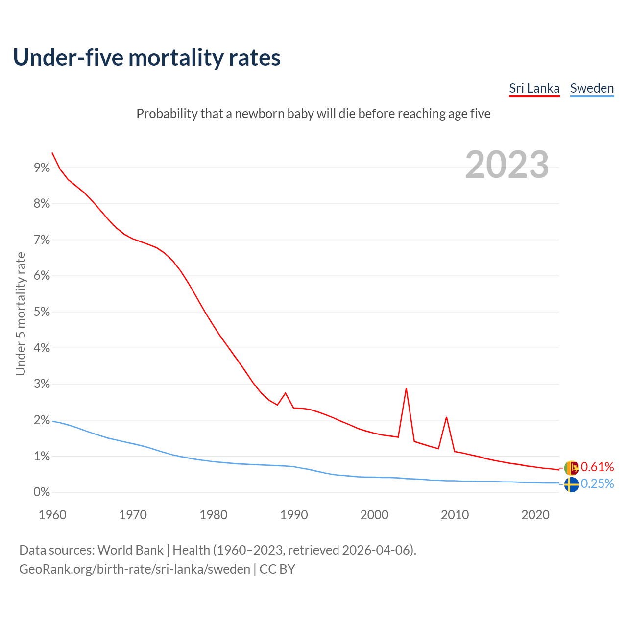 The chance that a newborn baby will die before reaching age five is 0.61% in Sri Lanka and 0.25% in Sweden. Above is a chart with historical data on under-five mortality rates.