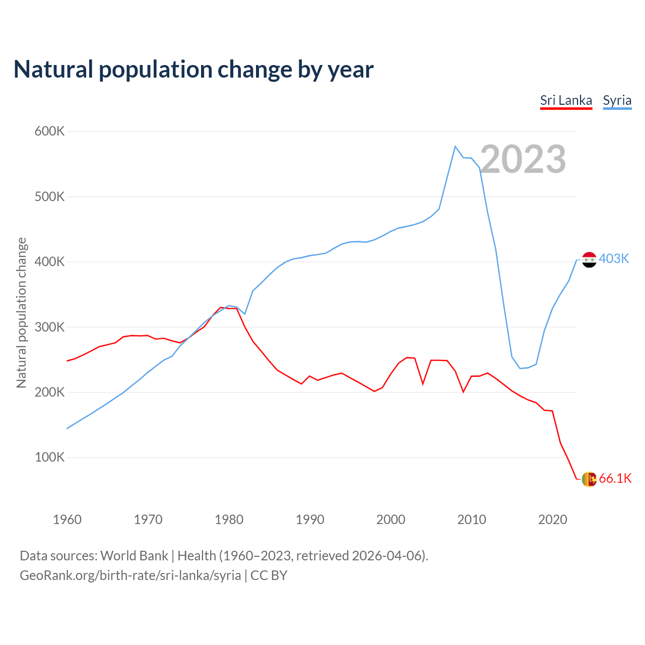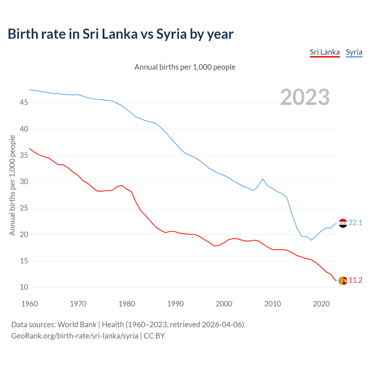 Sri Lanka has an annual birth rate of 11.2 births per 1,000 people, compared to 22.1 for Syria. The average number of children a woman is expected to have during her lifetime — the fertility rate, is 1.97 in Sri Lanka and 2.71 in Syria — 37.4% difference.