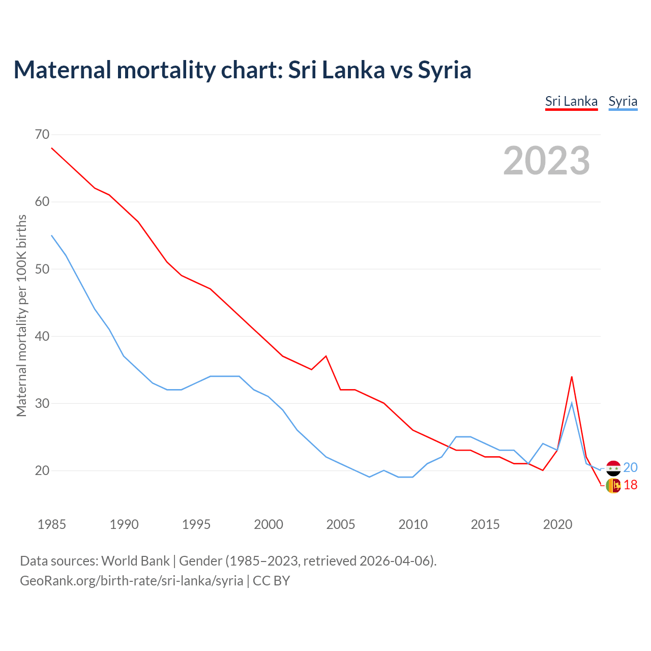 The maternal mortality rate, which is the probability of dying during childbirth or within 42 days of pregnancy termination, is 18 deaths per 100,000 live births in Sri Lanka, compared to 20 deaths in Syria.