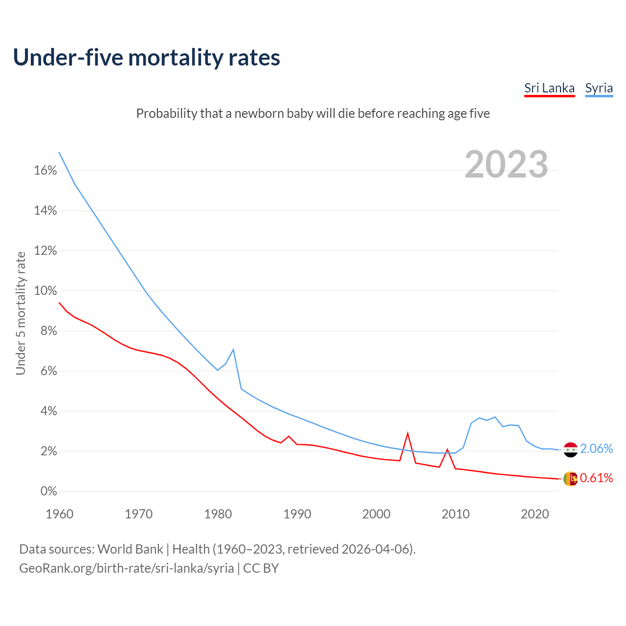 The chance that a newborn baby will die before reaching age five is 0.61% in Sri Lanka and 2.06% in Syria. Above is a chart with historical data on under-five mortality rates.