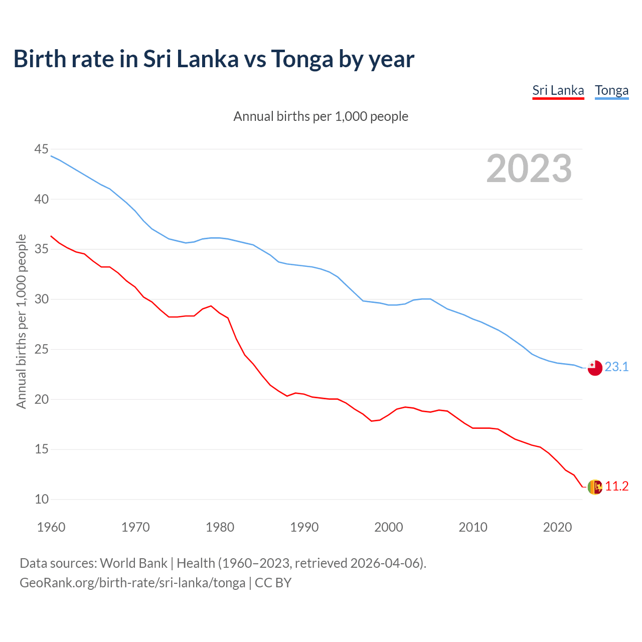 Sri Lanka has an annual birth rate of 11.2 births per 1,000 people, compared to 23.1 for Tonga. The average number of children a woman is expected to have during her lifetime — the fertility rate, is 1.97 in Sri Lanka and 3.13 in Tonga — 58.5% difference.