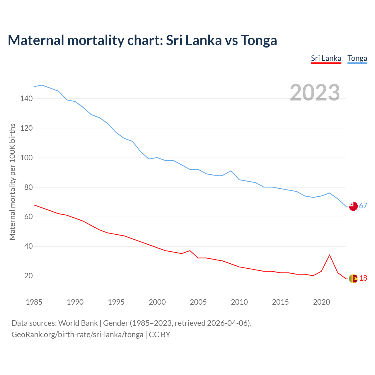The maternal mortality rate, which is the probability of dying during childbirth or within 42 days of pregnancy termination, is 18 deaths per 100,000 live births in Sri Lanka, compared to 67 deaths in Tonga.