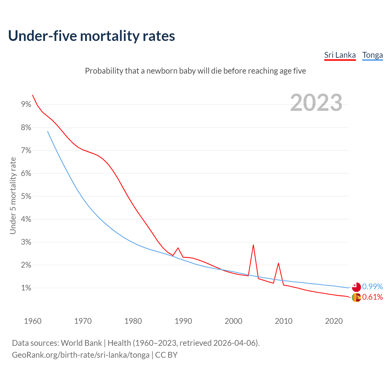 The chance that a newborn baby will die before reaching age five is 0.61% in Sri Lanka and 0.99% in Tonga. Above is a chart with historical data on under-five mortality rates.