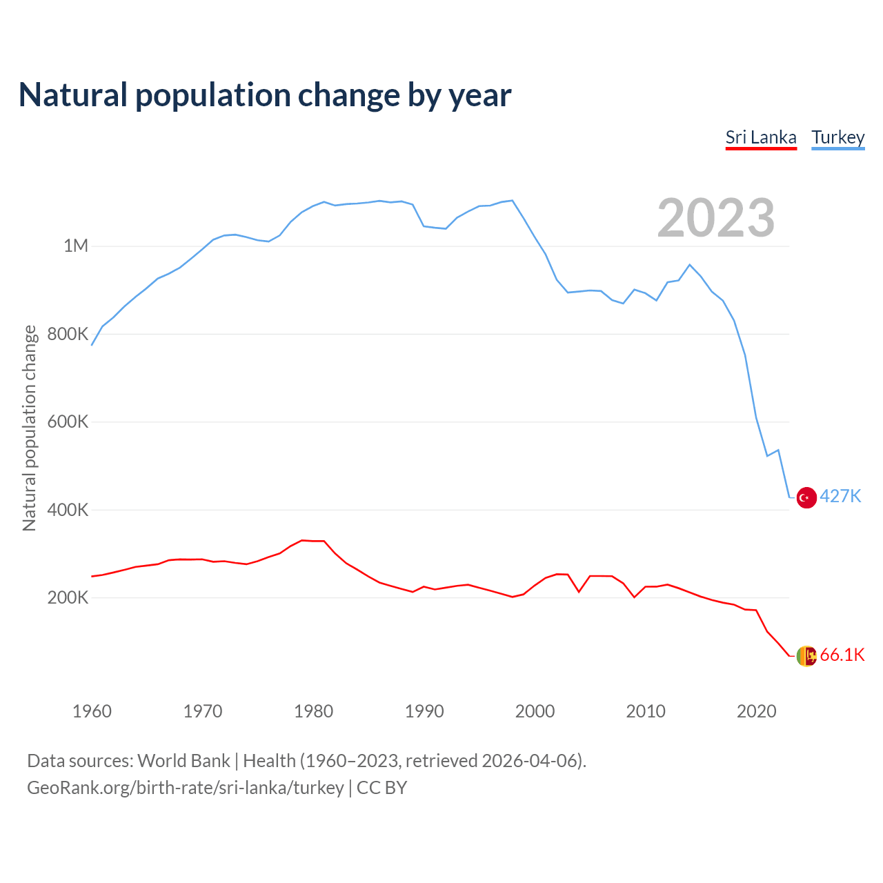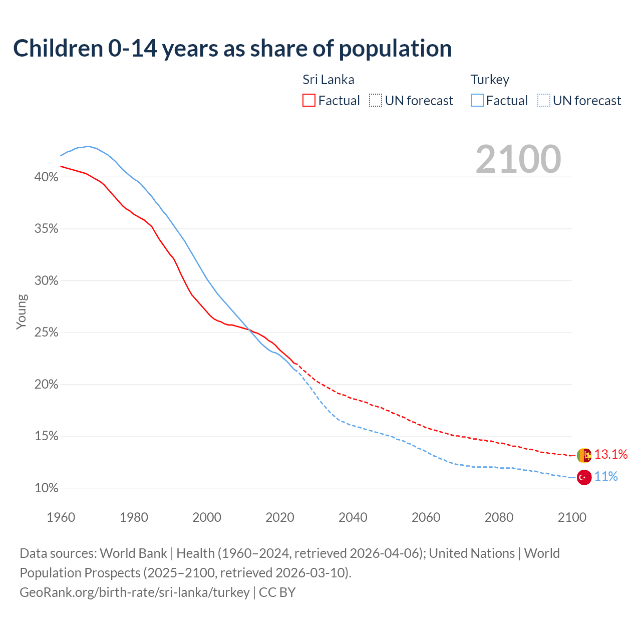 Sri Lanka has an annual birth rate of 11.2 births per 1,000 people, compared to 11.2 for Turkey. The average number of children a woman is expected to have during her lifetime — the fertility rate, is 1.97 in Sri Lanka and 1.51 in Turkey — 23.5% difference.