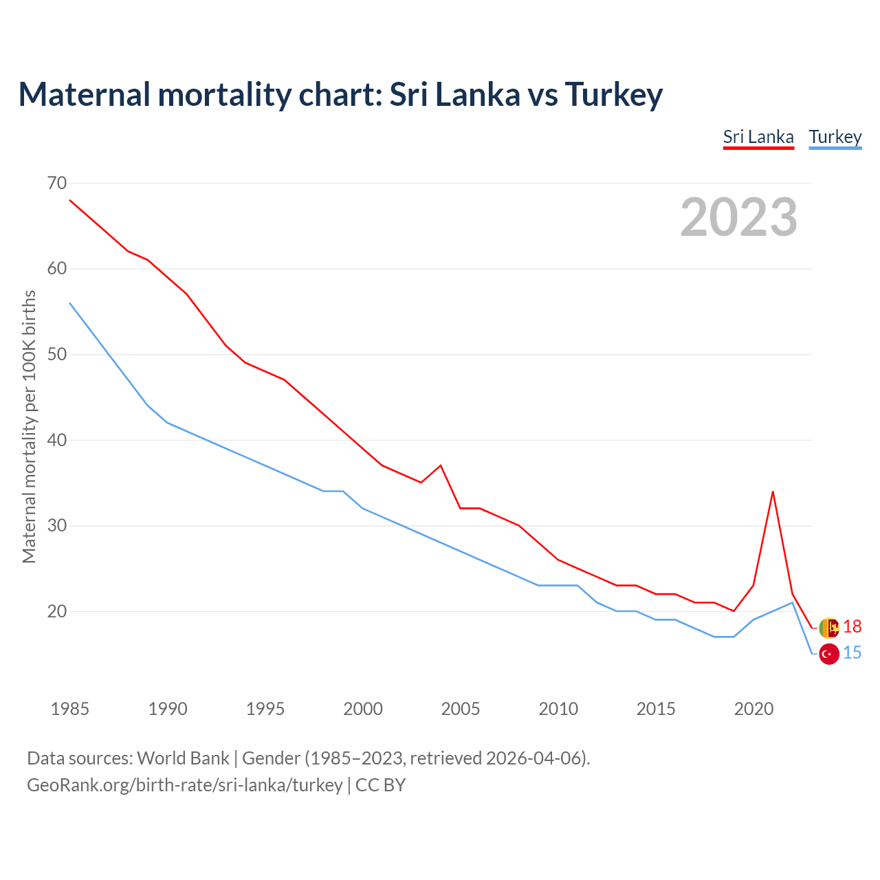 The maternal mortality rate, which is the probability of dying during childbirth or within 42 days of pregnancy termination, is 18 deaths per 100,000 live births in Sri Lanka, compared to 15 deaths in Turkey.