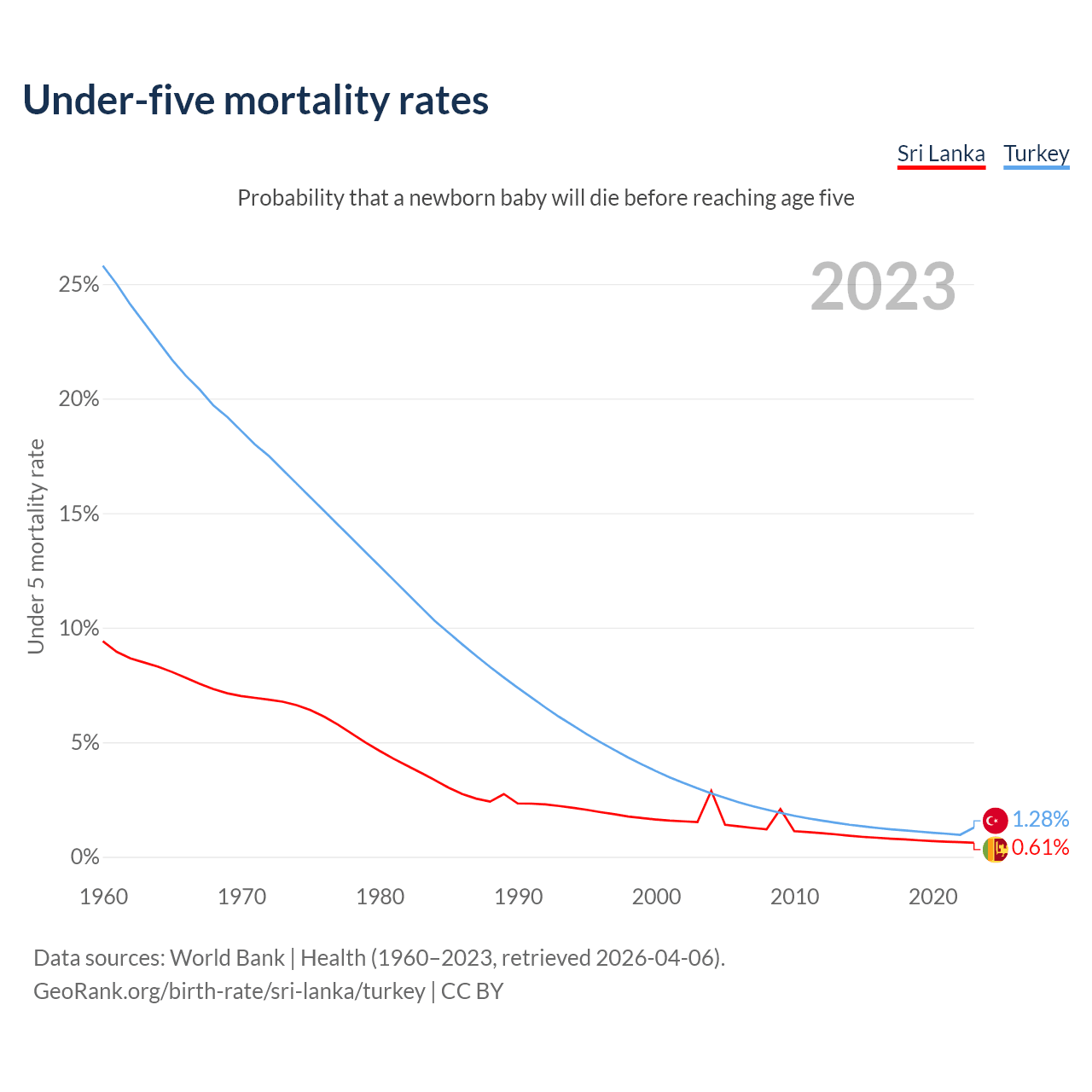 The chance that a newborn baby will die before reaching age five is 0.61% in Sri Lanka and 1.28% in Turkey. Above is a chart with historical data on under-five mortality rates.