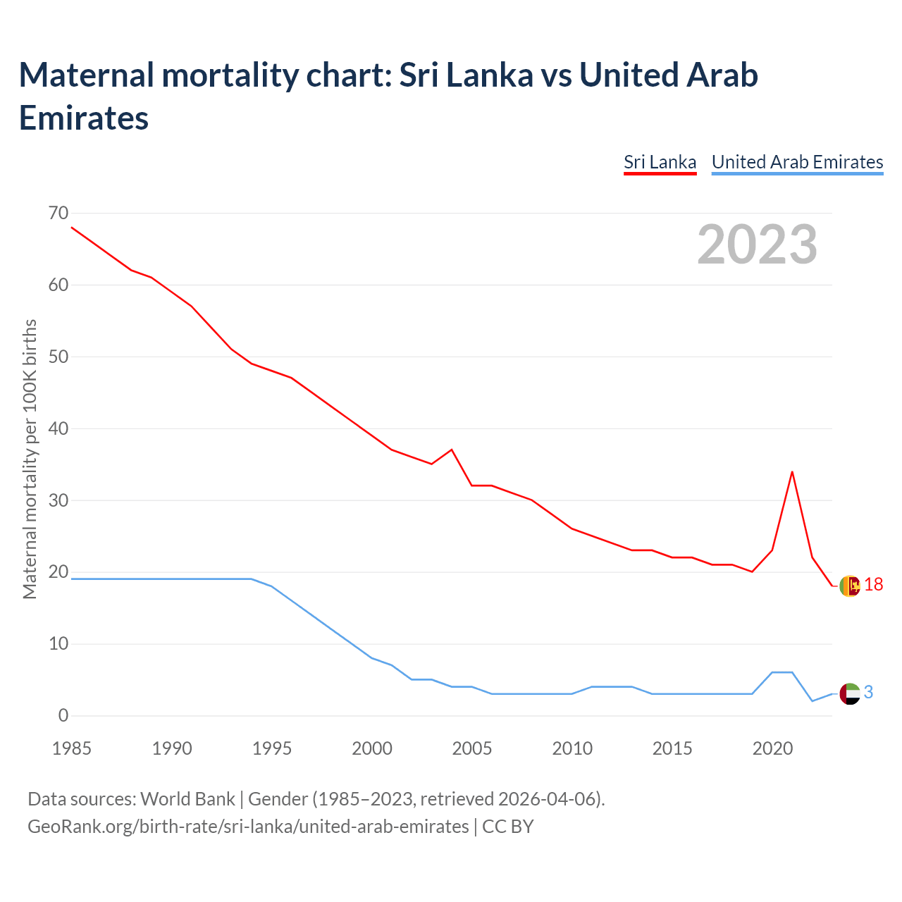 The maternal mortality rate, which is the probability of dying during childbirth or within 42 days of pregnancy termination, is 18 deaths per 100,000 live births in Sri Lanka, compared to 3 deaths in the United Arab Emirates.