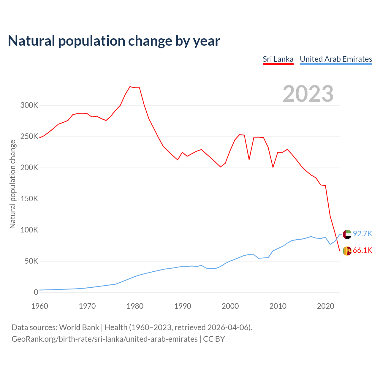 Sri Lanka has an annual birth rate of 11.2 births per 1,000 people, compared to 9.77 for the United Arab Emirates. The average number of children a woman is expected to have during her lifetime — the fertility rate, is 1.97 in Sri Lanka and 1.2 in the United Arab Emirates — 39.2% difference.