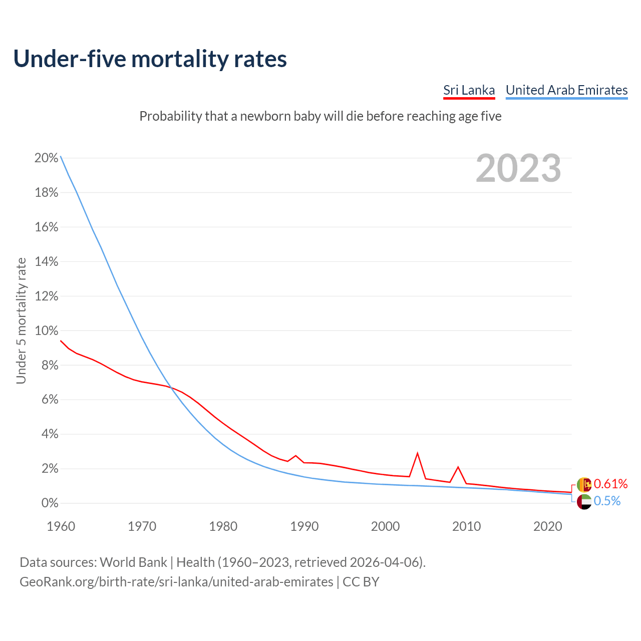 The chance that a newborn baby will die before reaching age five is 0.61% in Sri Lanka and 0.5% in the United Arab Emirates. Above is a chart with historical data on under-five mortality rates.