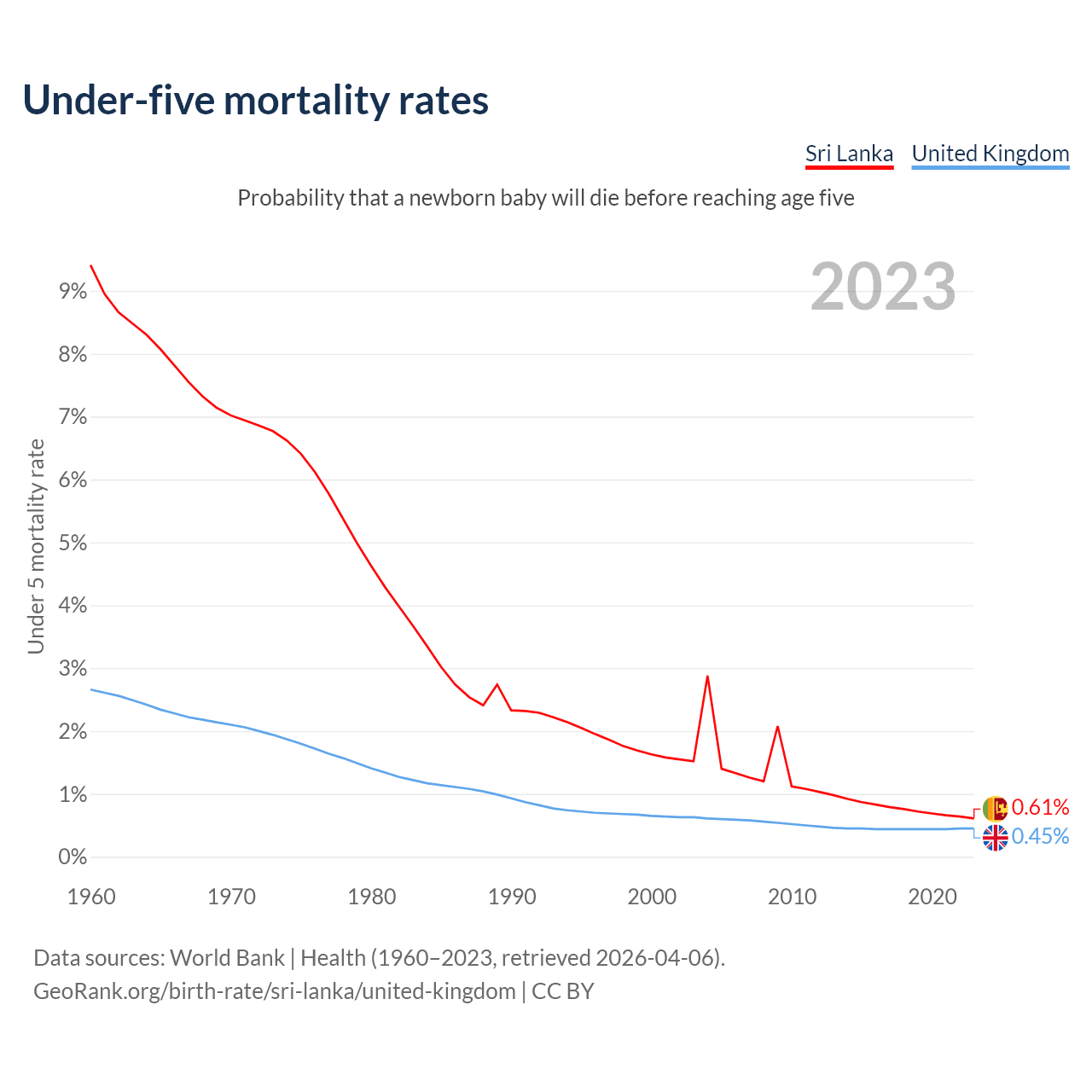 The chance that a newborn baby will die before reaching age five is 0.61% in Sri Lanka and 0.45% in the United Kingdom. Above is a chart with historical data on under-five mortality rates.