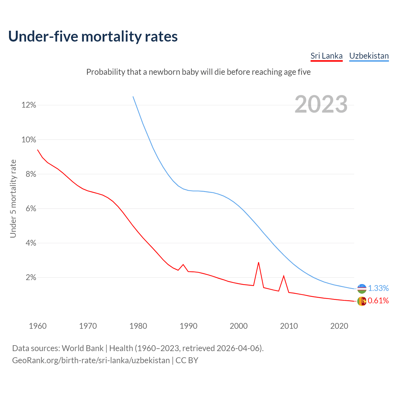 The chance that a newborn baby will die before reaching age five is 0.61% in Sri Lanka and 1.33% in Uzbekistan. Above is a chart with historical data on under-five mortality rates.