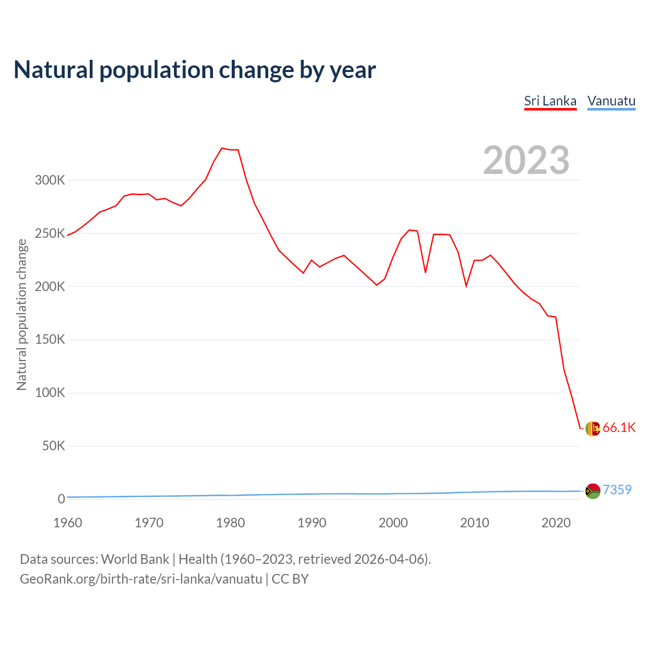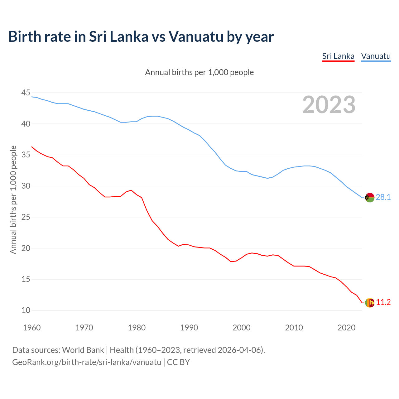 Sri Lanka has an annual birth rate of 11.2 births per 1,000 people, compared to 28.1 for Vanuatu. The average number of children a woman is expected to have during her lifetime — the fertility rate, is 1.97 in Sri Lanka and 3.6 in Vanuatu — 82.2% difference.