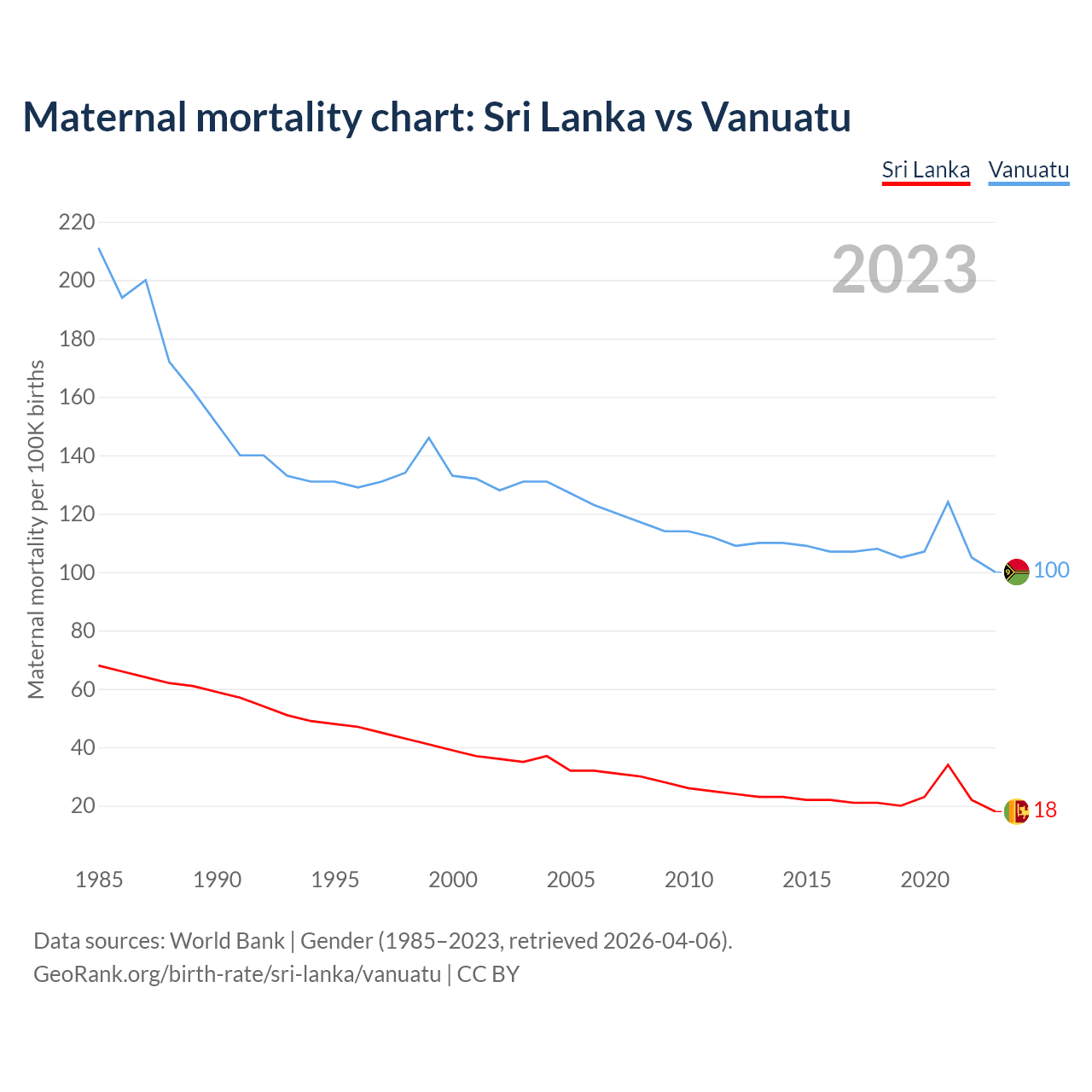 The maternal mortality rate, which is the probability of dying during childbirth or within 42 days of pregnancy termination, is 18 deaths per 100,000 live births in Sri Lanka, compared to 100 deaths in Vanuatu.