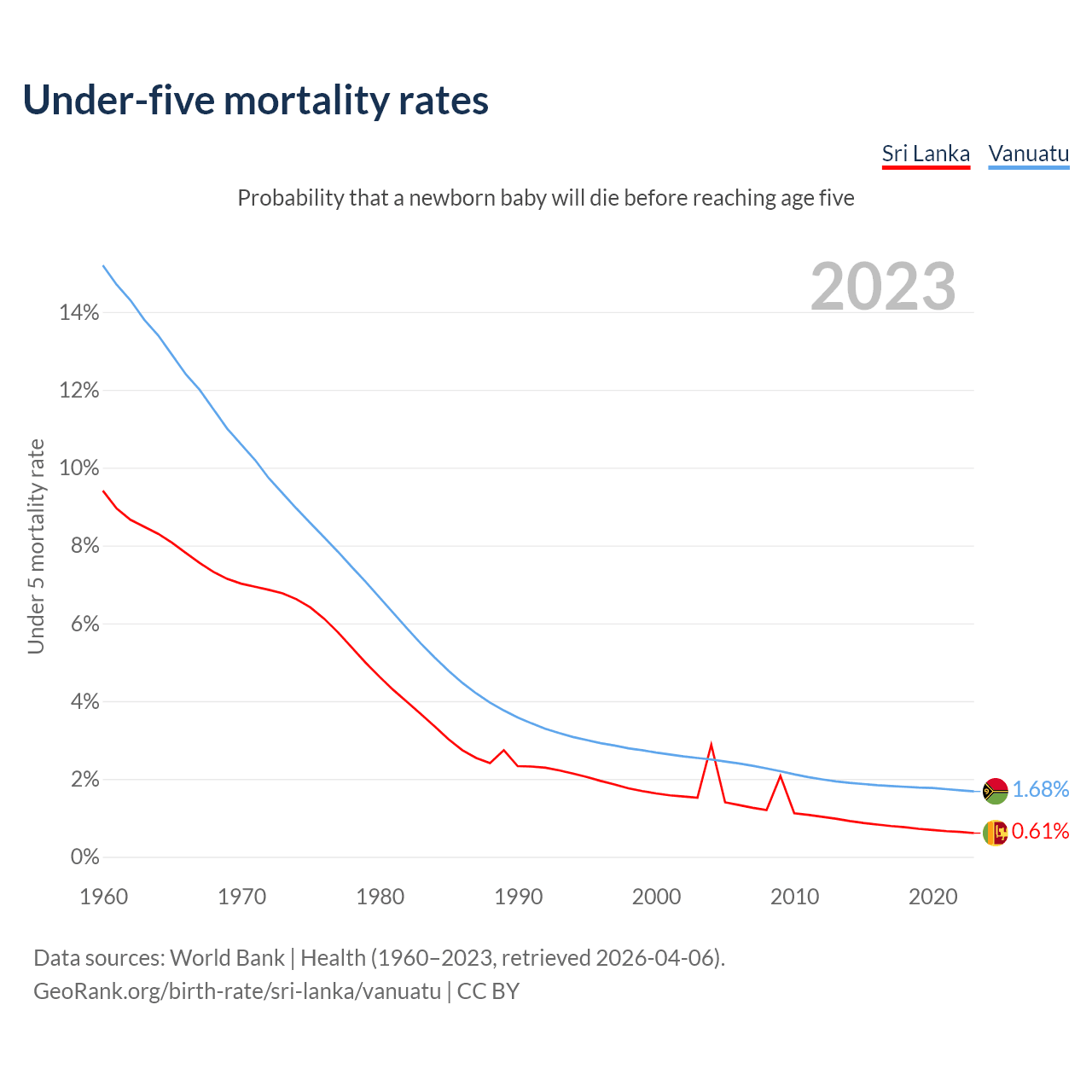 The chance that a newborn baby will die before reaching age five is 0.61% in Sri Lanka and 1.68% in Vanuatu. Above is a chart with historical data on under-five mortality rates.