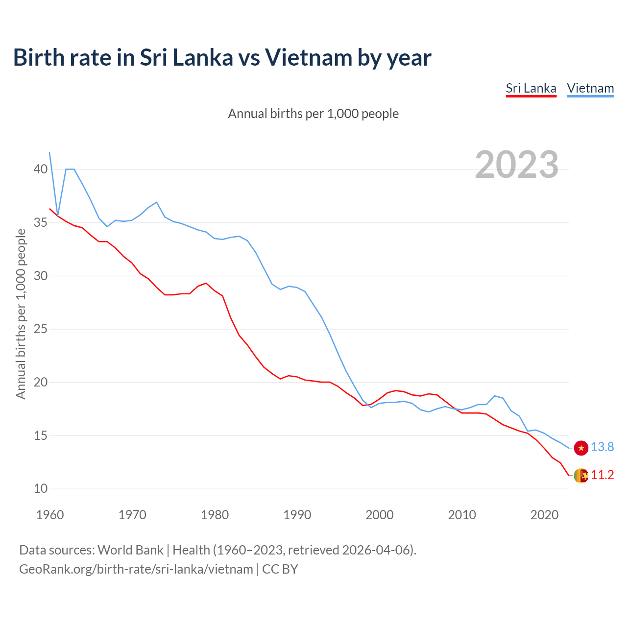 According to the latest available data on birth rates, the fertility rate in Sri Lanka was 1.97 children per woman in 2023, compared to 1.91 in Vietnam in 2023. The replacement level is considered to be 2.1 children per woman.