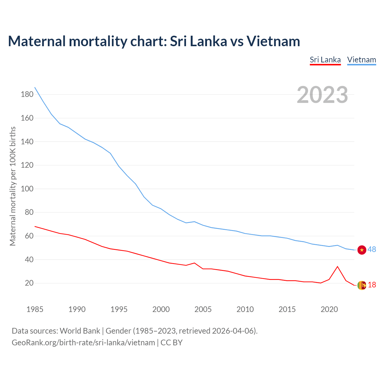The maternal mortality rate, which is the probability of dying during childbirth or within 42 days of pregnancy termination, is 18 deaths per 100,000 live births in Sri Lanka, compared to 48 deaths in Vietnam.