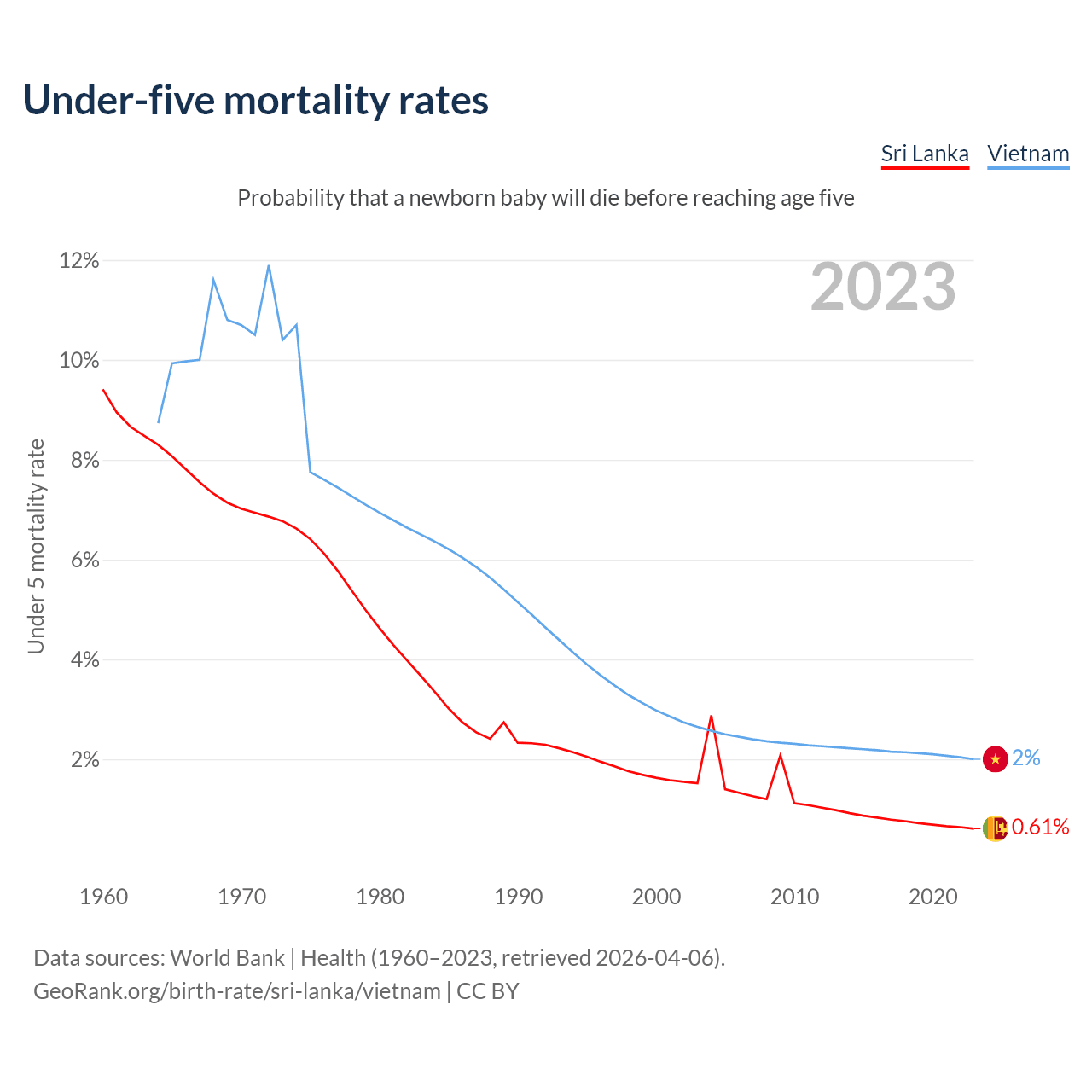 The chance that a newborn baby will die before reaching age five is 0.61% in Sri Lanka and 2% in Vietnam. Above is a chart with historical data on under-five mortality rates.