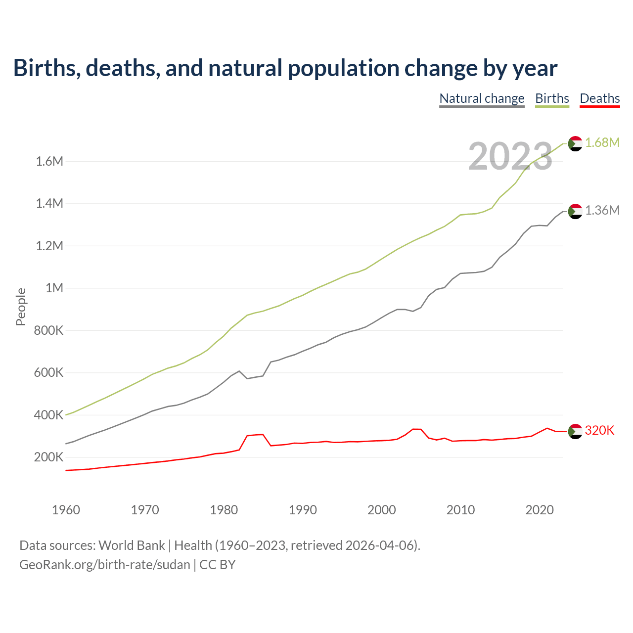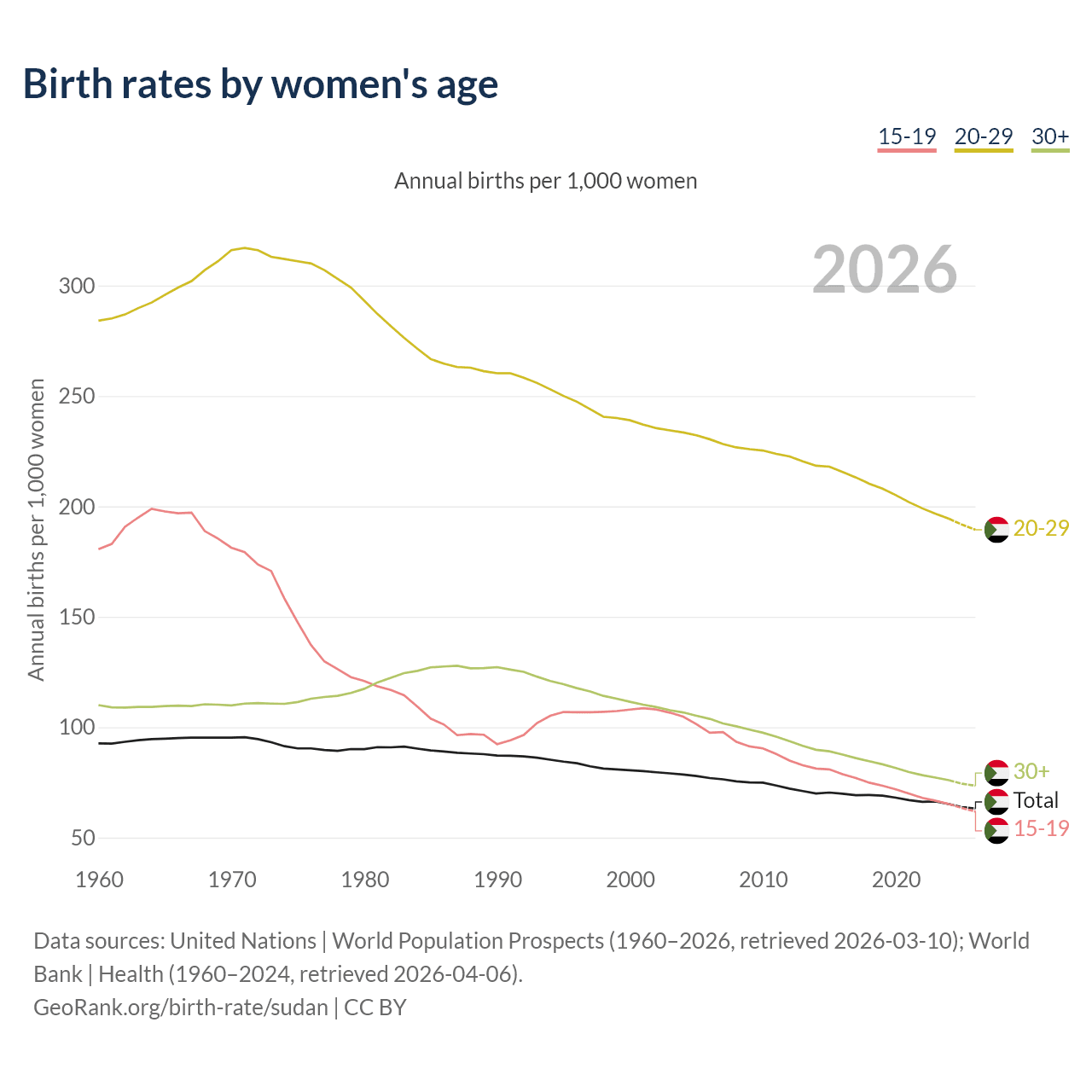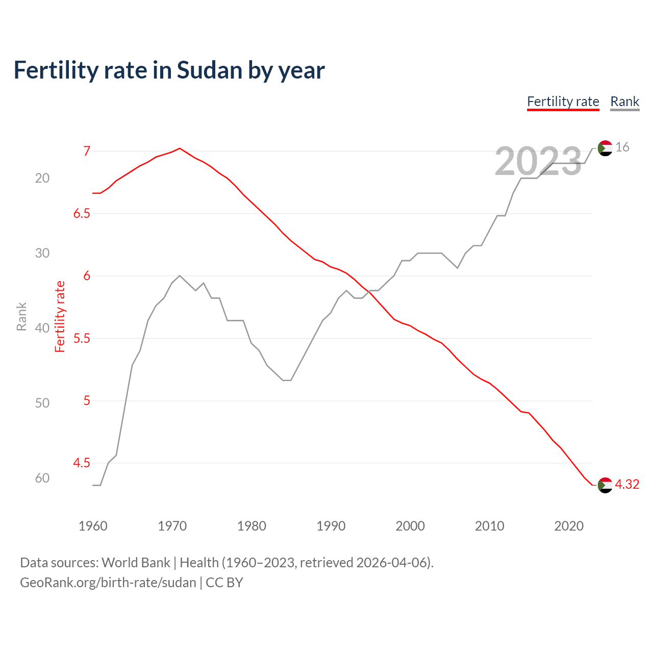 Sudan has a birth rate of 33.6 (annual births per 1,000 people) and a fertility rate of 4.32 (the average number of children a woman is expected to have over her lifetime based on current age-specific birth rates).