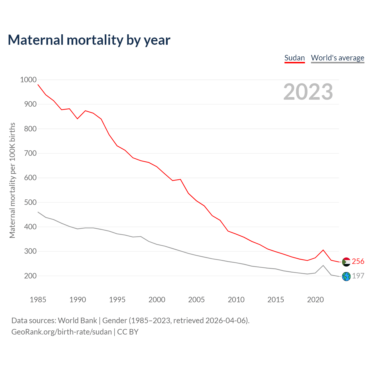 The maternal mortality rate in Sudan was 256 deaths per 100,000 live births in 2023 — a 0.26% chance of dying during childbirth or within 42 days of pregnancy termination. This is a 60.3% decrease compared to the year 2000.