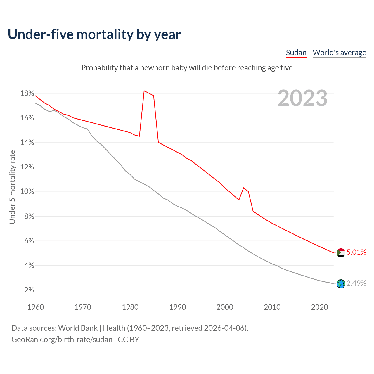 The under-5 mortality rate in Sudan was 50.1 deaths per 1,000 live births in 2023 — a 5.01% chance that a newborn baby will die before reaching age five. This is down from 103.4 deaths per 1,000 live births in 2000.