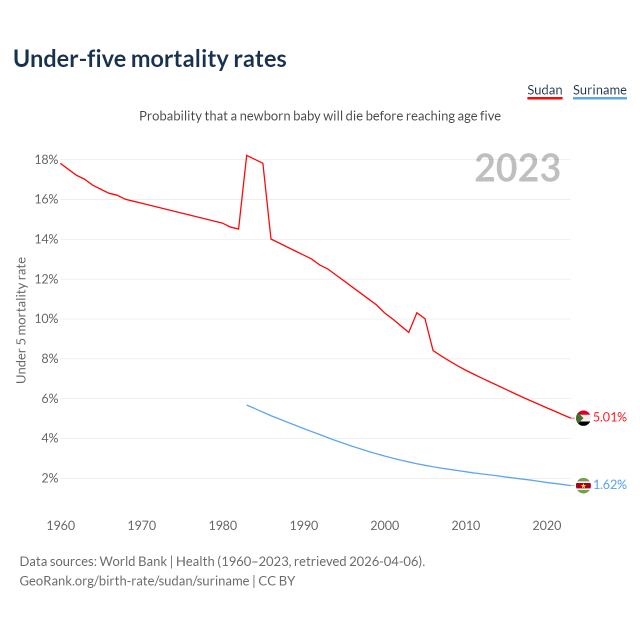 The chance that a newborn baby will die before reaching age five is 5.01% in Sudan and 1.62% in Suriname. Above is a chart with historical data on under-five mortality rates.