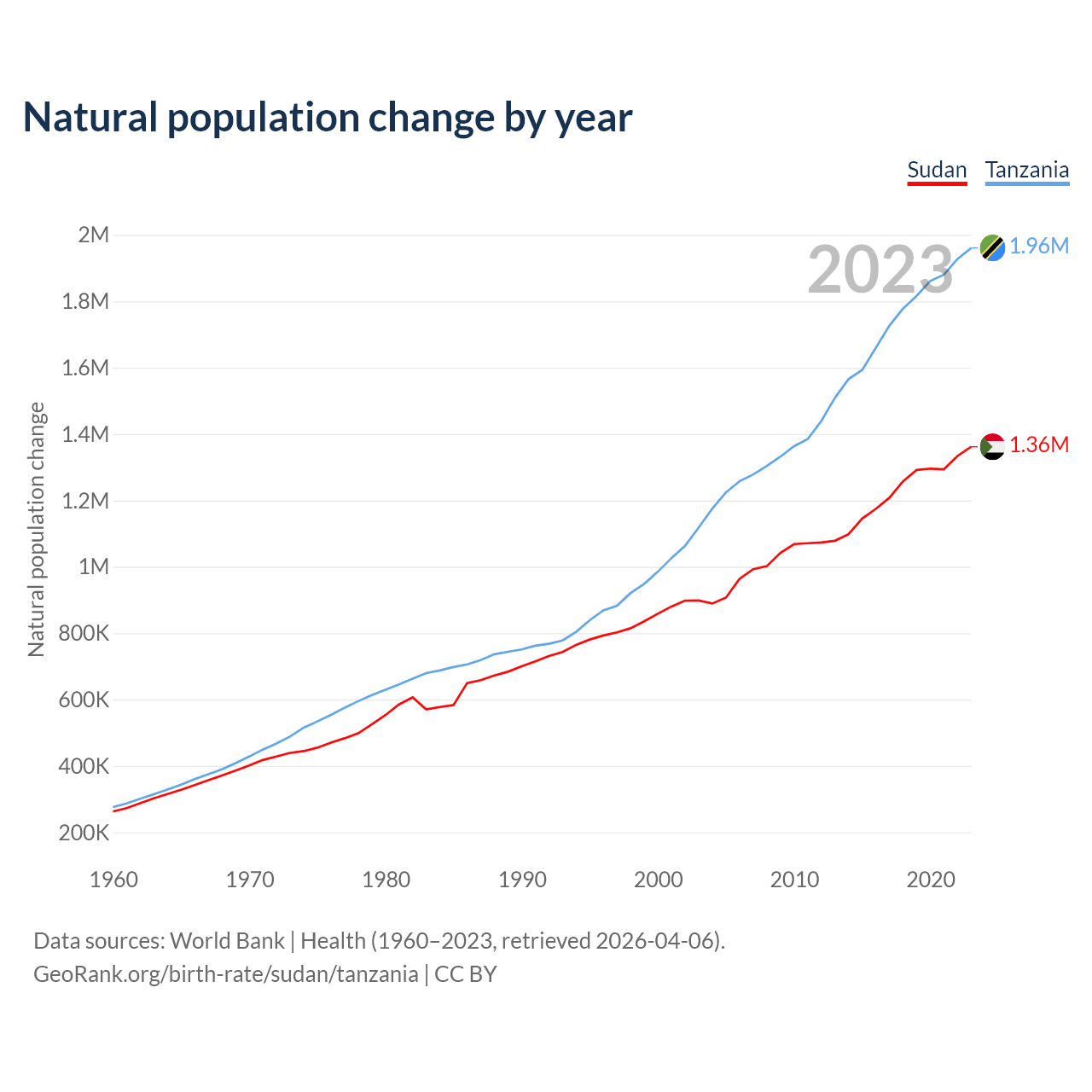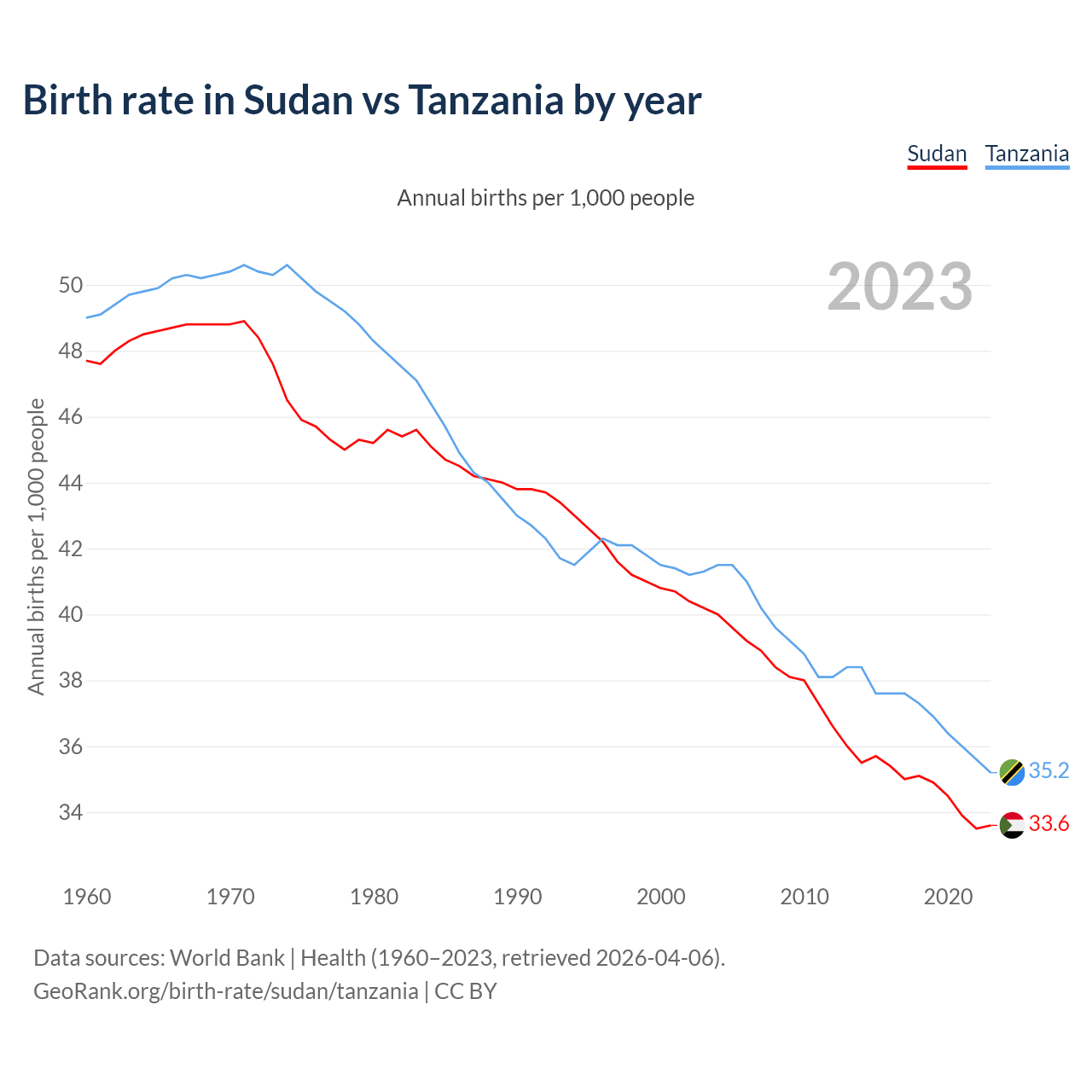 Sudan has an annual birth rate of 33.6 births per 1,000 people, compared to 35.2 for Tanzania. The average number of children a woman is expected to have during her lifetime — the fertility rate, is 4.32 in Sudan and 4.61 in Tanzania — 6.55% difference.