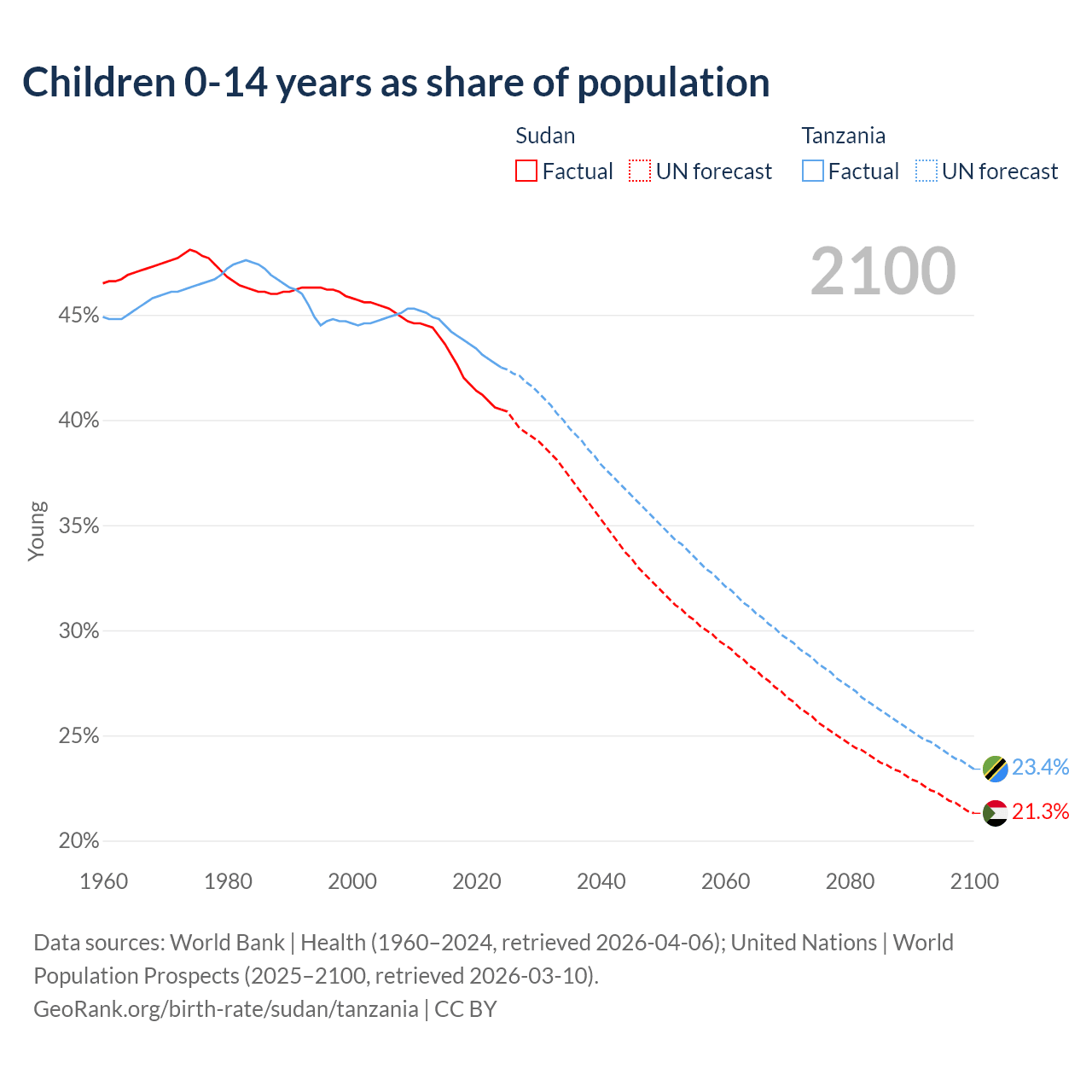 According to the latest available data on birth rates, the fertility rate in Sudan was 4.32 children per woman in 2023, compared to 4.61 in Tanzania in 2023. The replacement level is considered to be 2.1 children per woman.