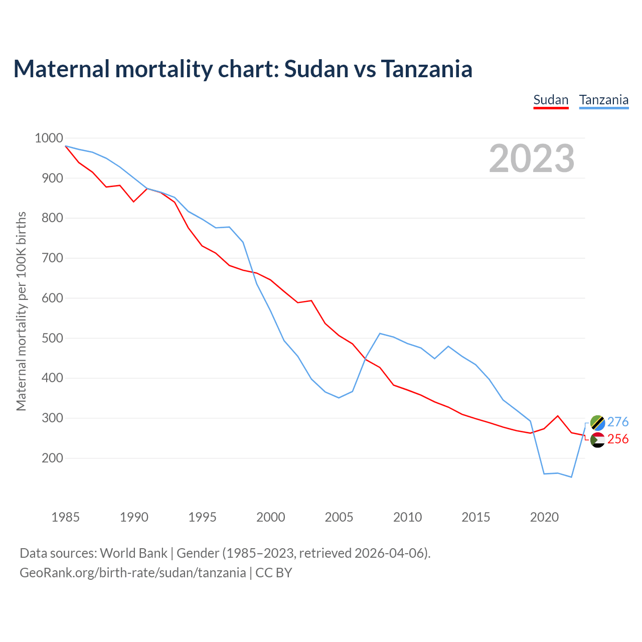 The maternal mortality rate, which is the probability of dying during childbirth or within 42 days of pregnancy termination, is 256 deaths per 100,000 live births in Sudan, compared to 276 deaths in Tanzania.