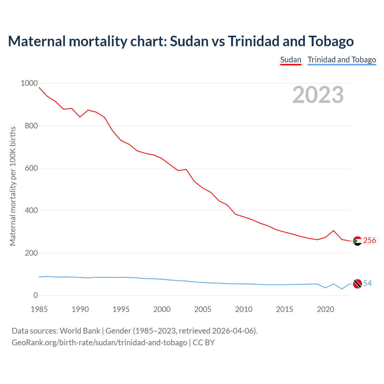 The maternal mortality rate, which is the probability of dying during childbirth or within 42 days of pregnancy termination, is 256 deaths per 100,000 live births in Sudan, compared to 54 deaths in Trinidad and Tobago.