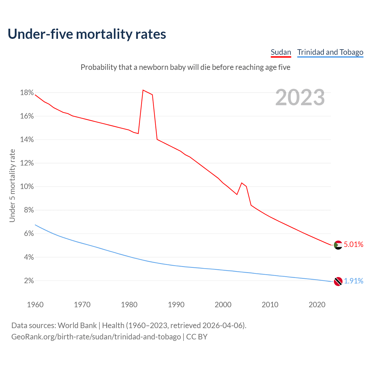 The chance that a newborn baby will die before reaching age five is 5.01% in Sudan and 1.91% in Trinidad and Tobago. Above is a chart with historical data on under-five mortality rates.