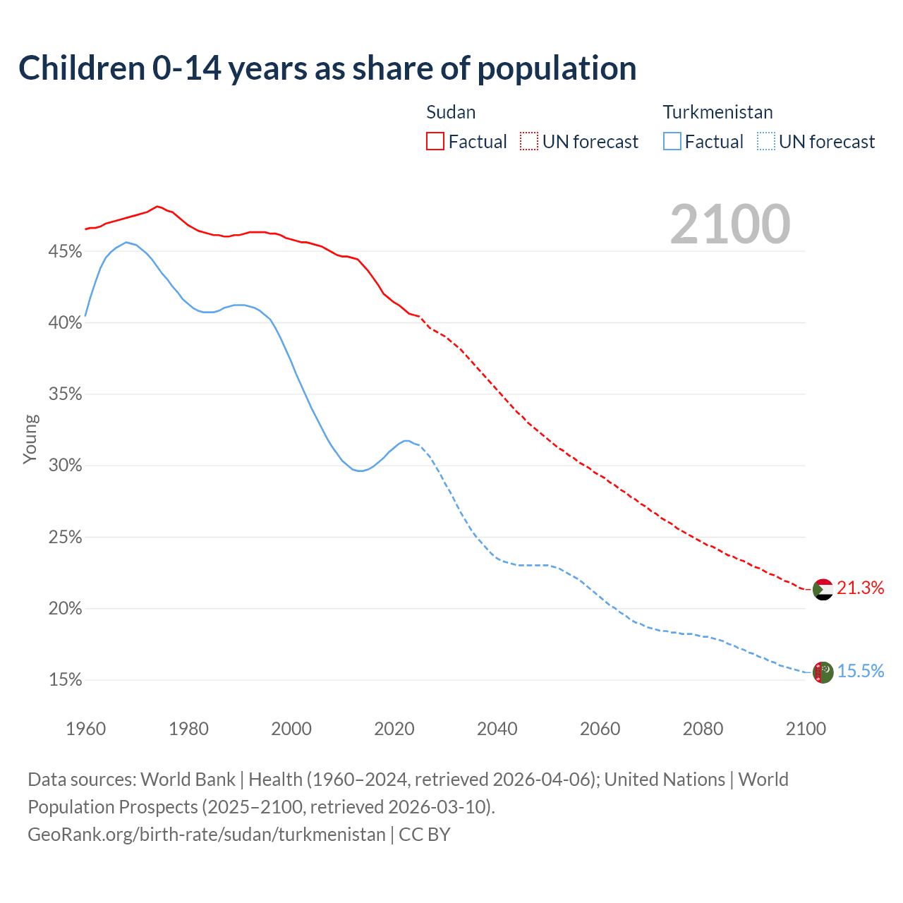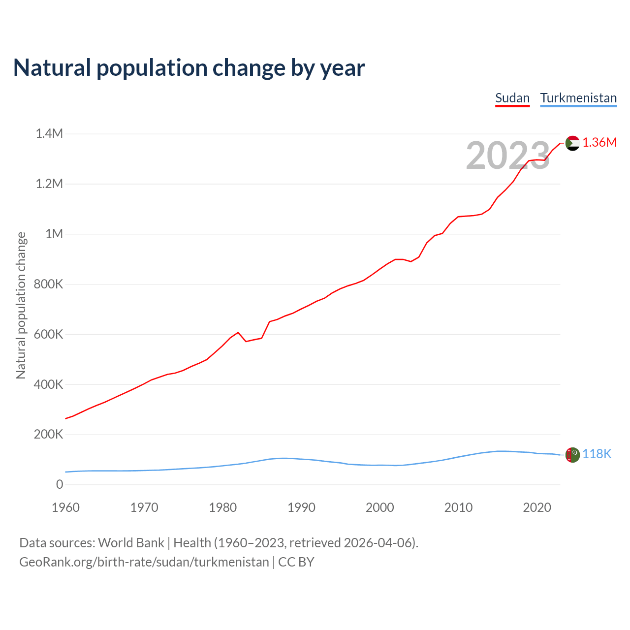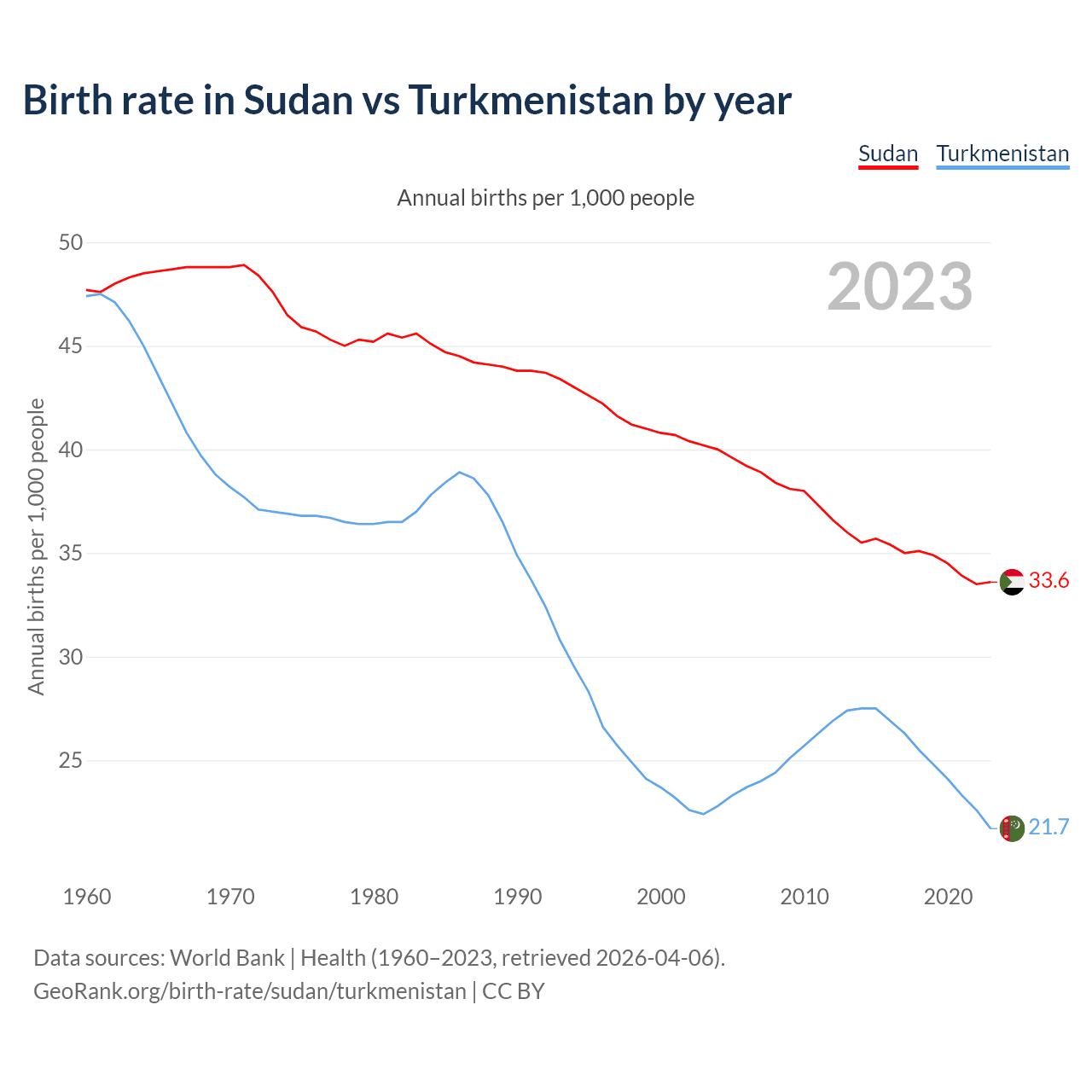 Sudan has an annual birth rate of 33.6 births per 1,000 people, compared to 21.7 for Turkmenistan. The average number of children a woman is expected to have during her lifetime — the fertility rate, is 4.32 in Sudan and 2.69 in Turkmenistan — 37.8% difference.