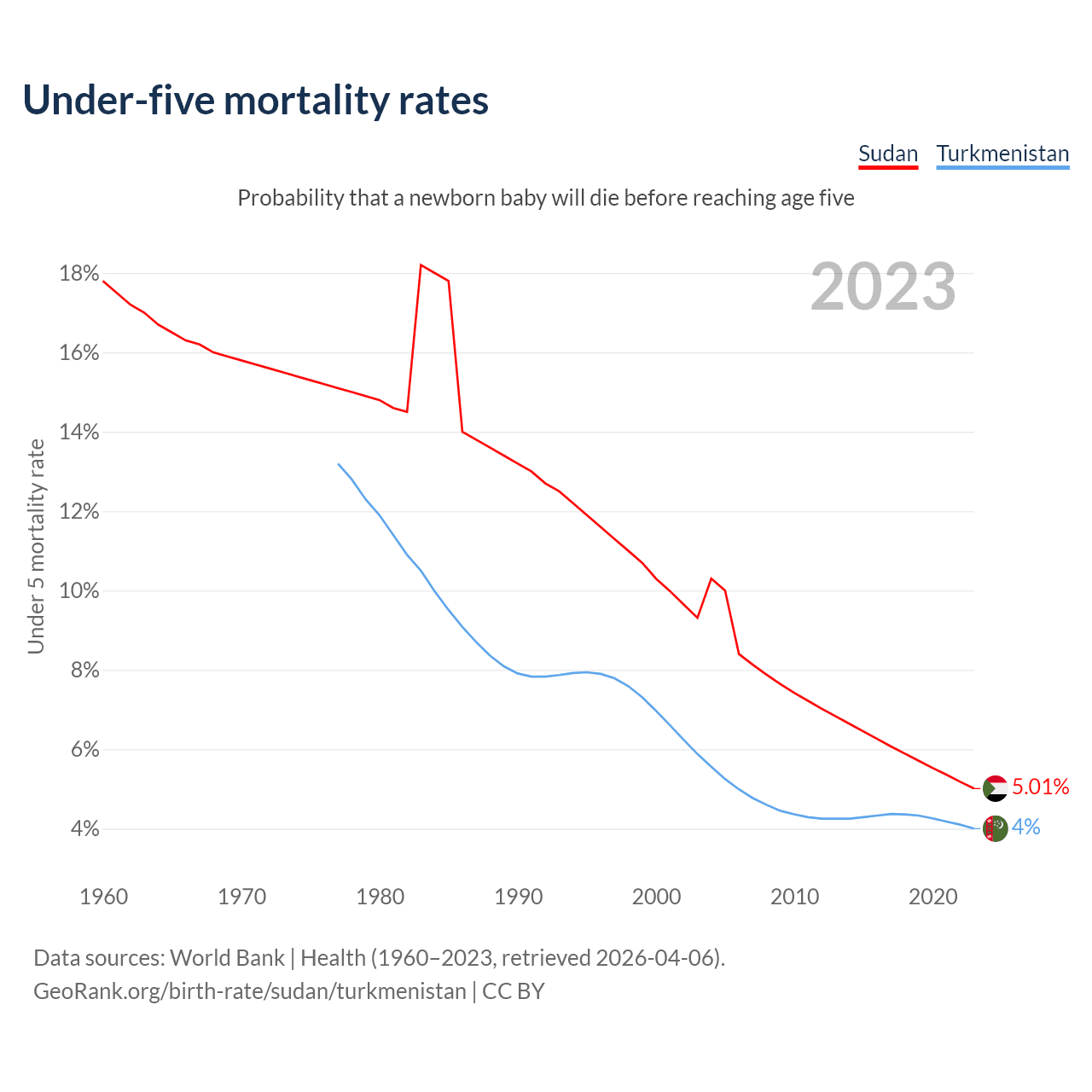 The chance that a newborn baby will die before reaching age five is 5.01% in Sudan and 4% in Turkmenistan. Above is a chart with historical data on under-five mortality rates.