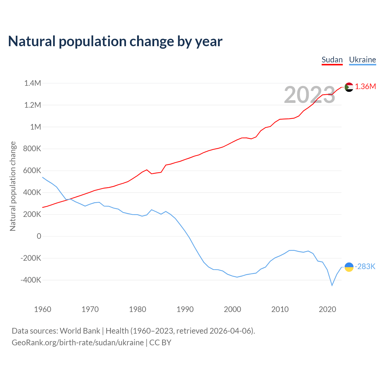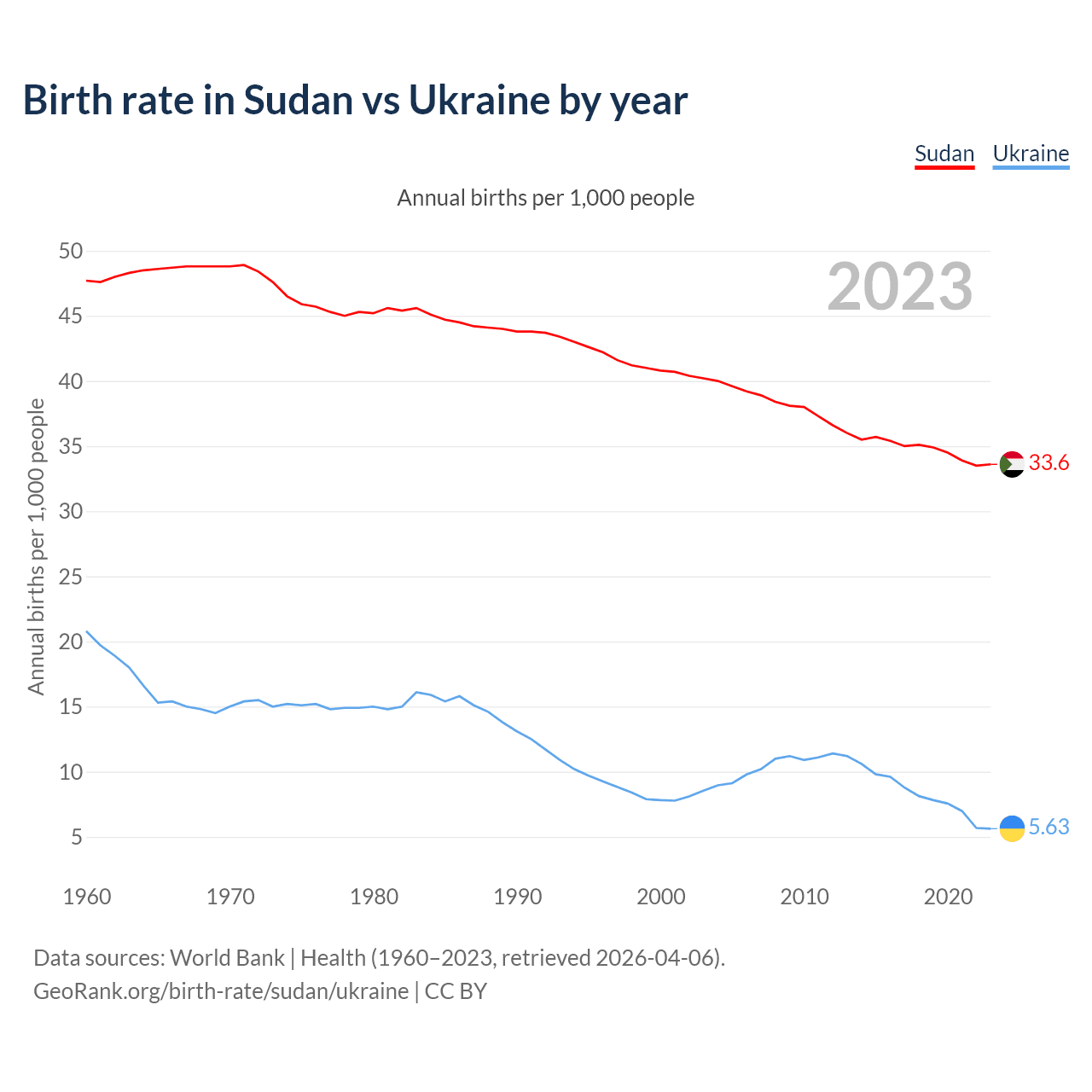 Sudan has an annual birth rate of 33.6 births per 1,000 people, compared to 5.63 for Ukraine. The average number of children a woman is expected to have during her lifetime — the fertility rate, is 4.32 in Sudan and 0.98 in Ukraine — 77.4% difference.