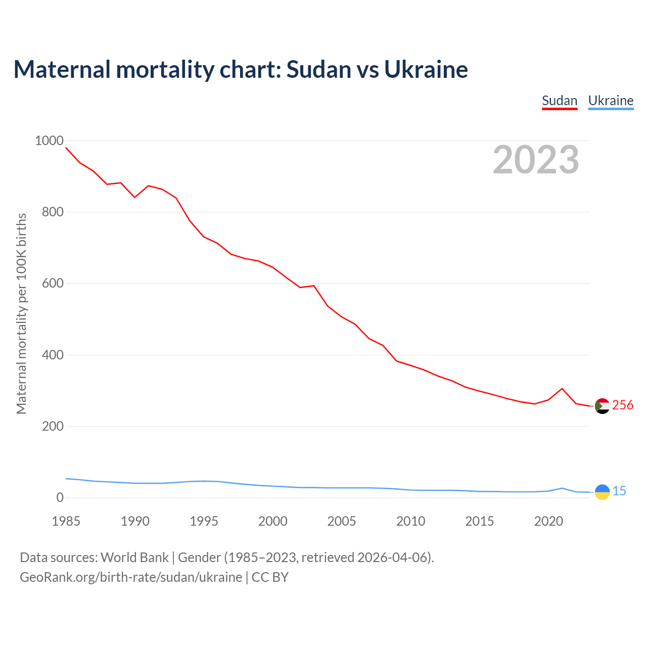 The maternal mortality rate, which is the probability of dying during childbirth or within 42 days of pregnancy termination, is 256 deaths per 100,000 live births in Sudan, compared to 15 deaths in Ukraine.