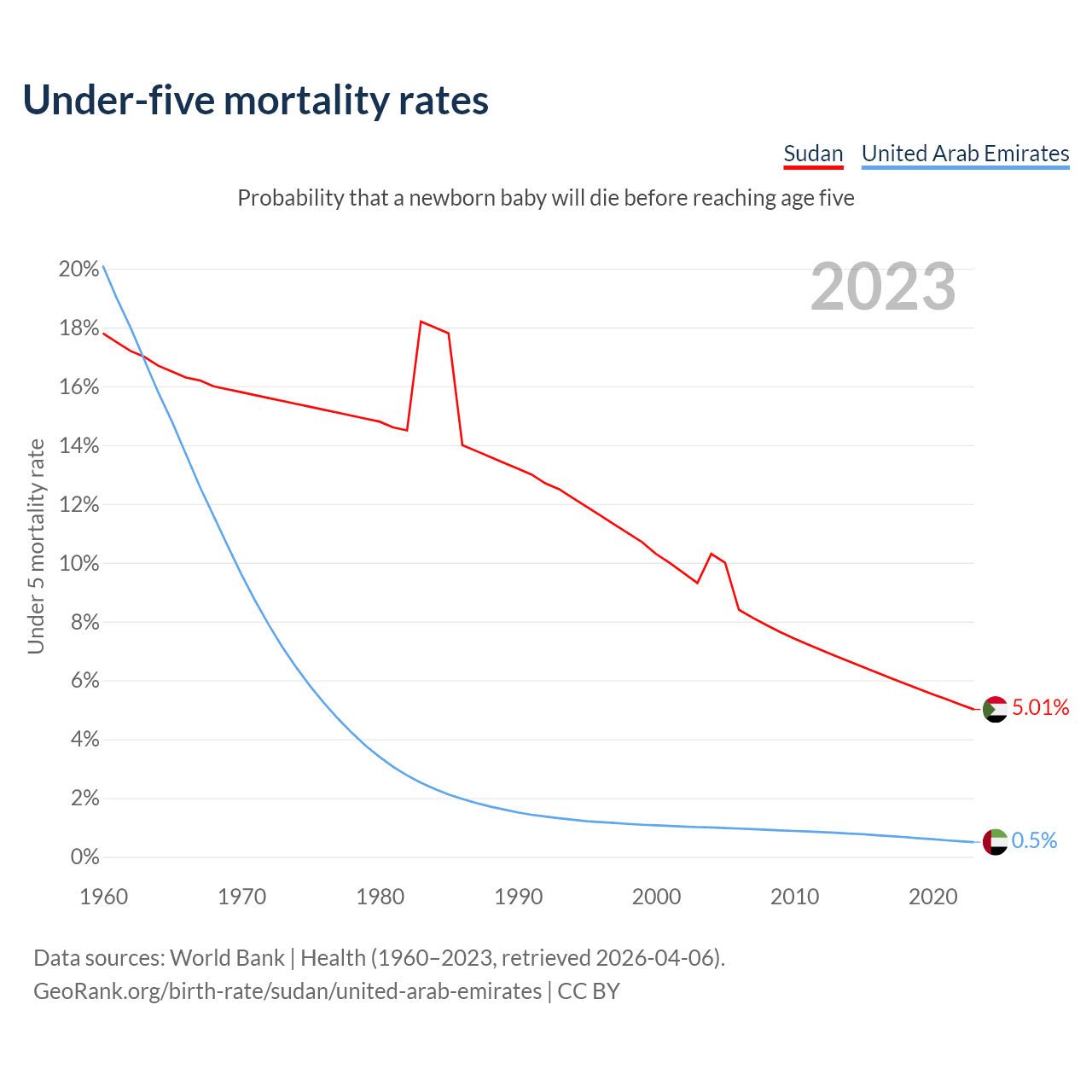 The chance that a newborn baby will die before reaching age five is 5.01% in Sudan and 0.5% in the United Arab Emirates. Above is a chart with historical data on under-five mortality rates.