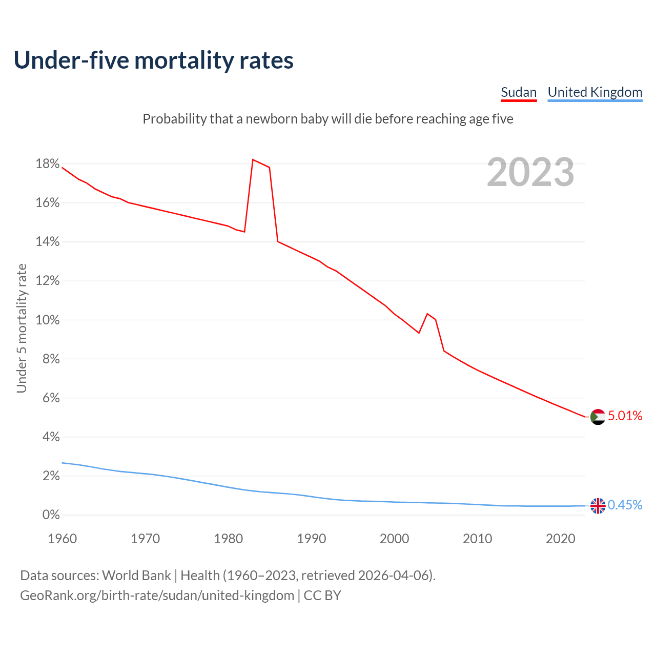 The chance that a newborn baby will die before reaching age five is 5.01% in Sudan and 0.45% in the United Kingdom. Above is a chart with historical data on under-five mortality rates.