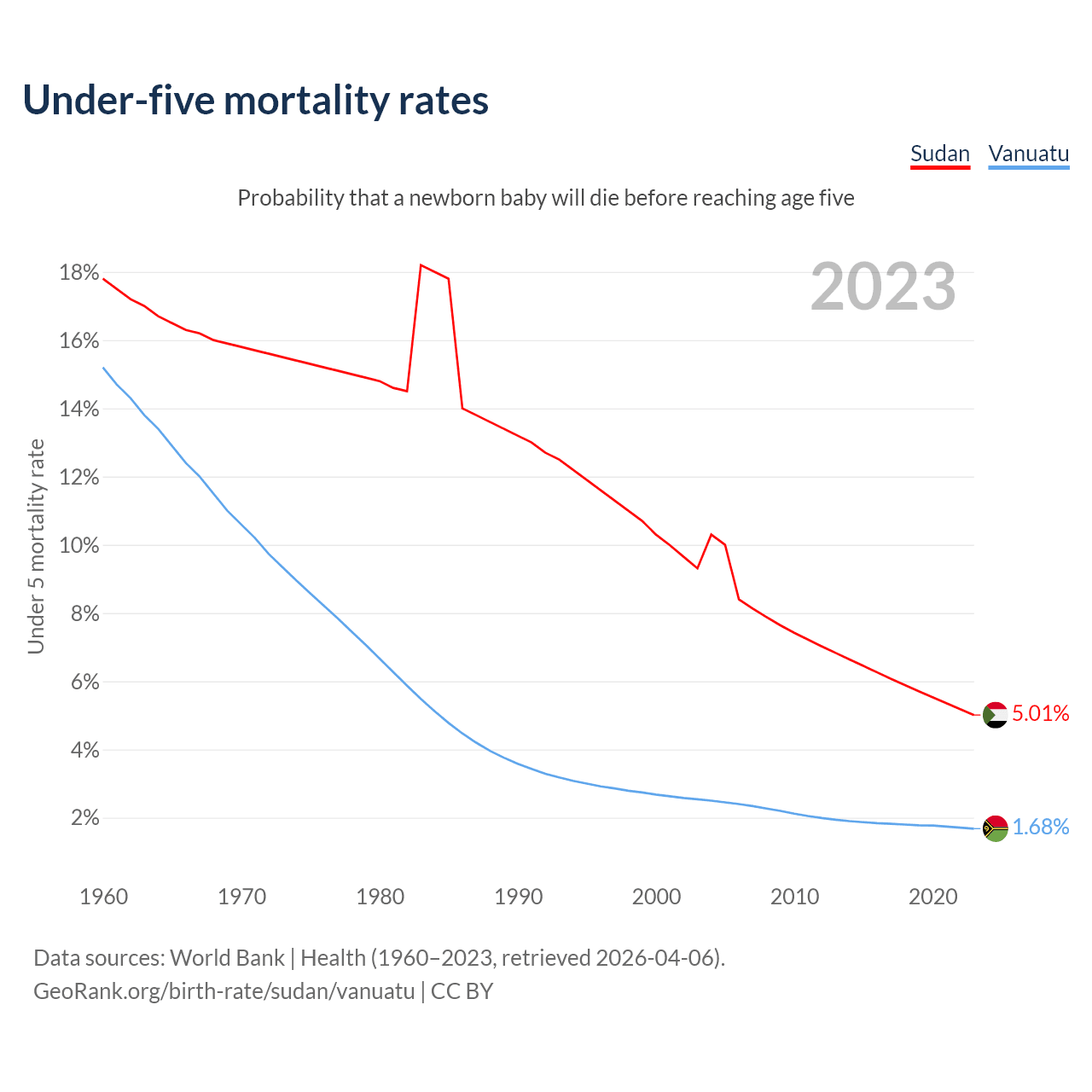 The chance that a newborn baby will die before reaching age five is 5.01% in Sudan and 1.68% in Vanuatu. Above is a chart with historical data on under-five mortality rates.