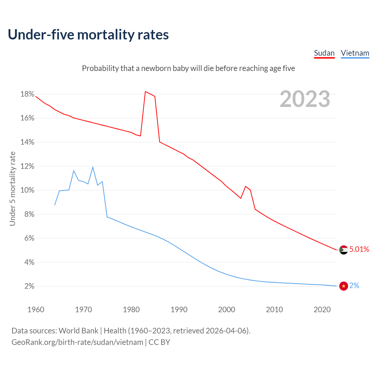 The chance that a newborn baby will die before reaching age five is 5.01% in Sudan and 2% in Vietnam. Above is a chart with historical data on under-five mortality rates.