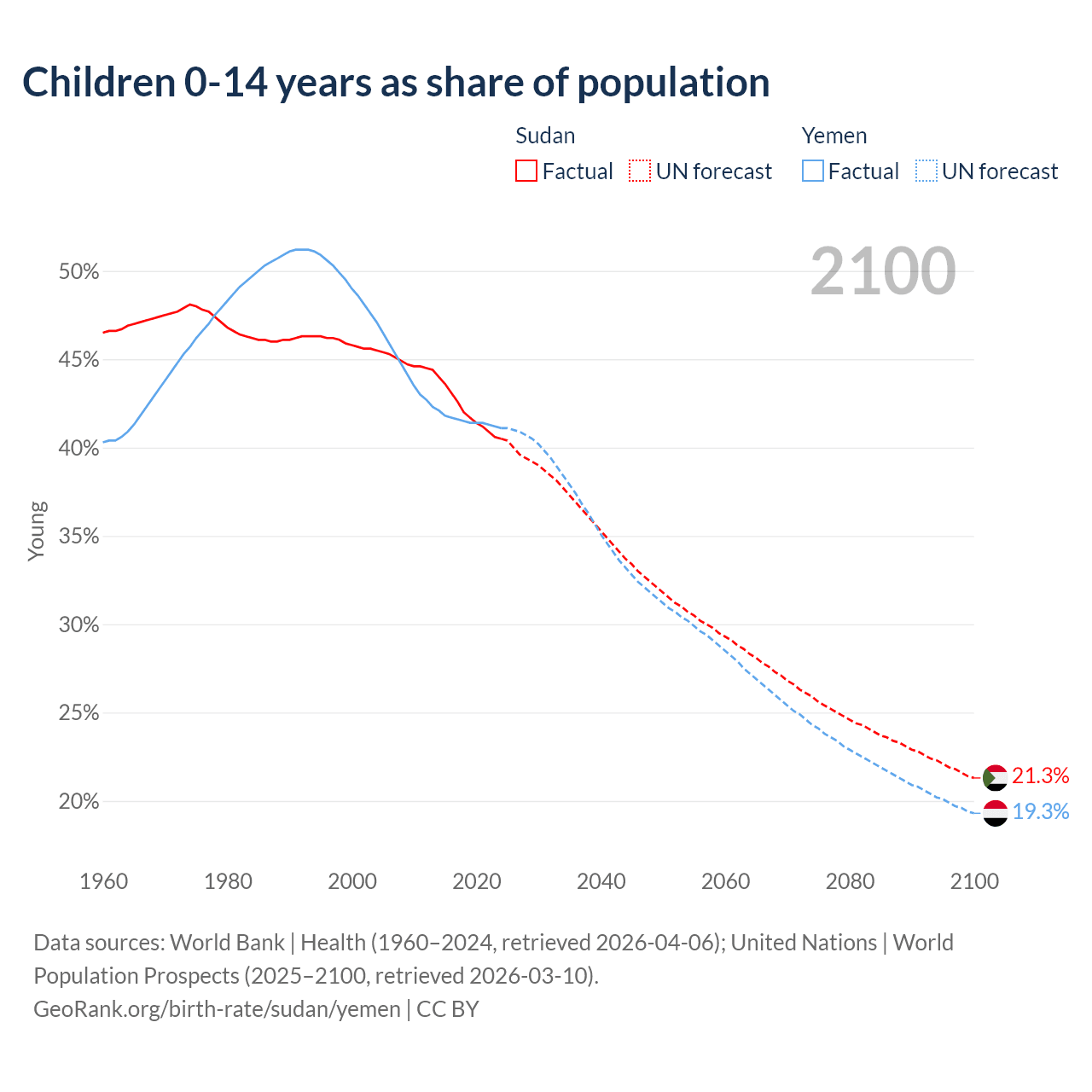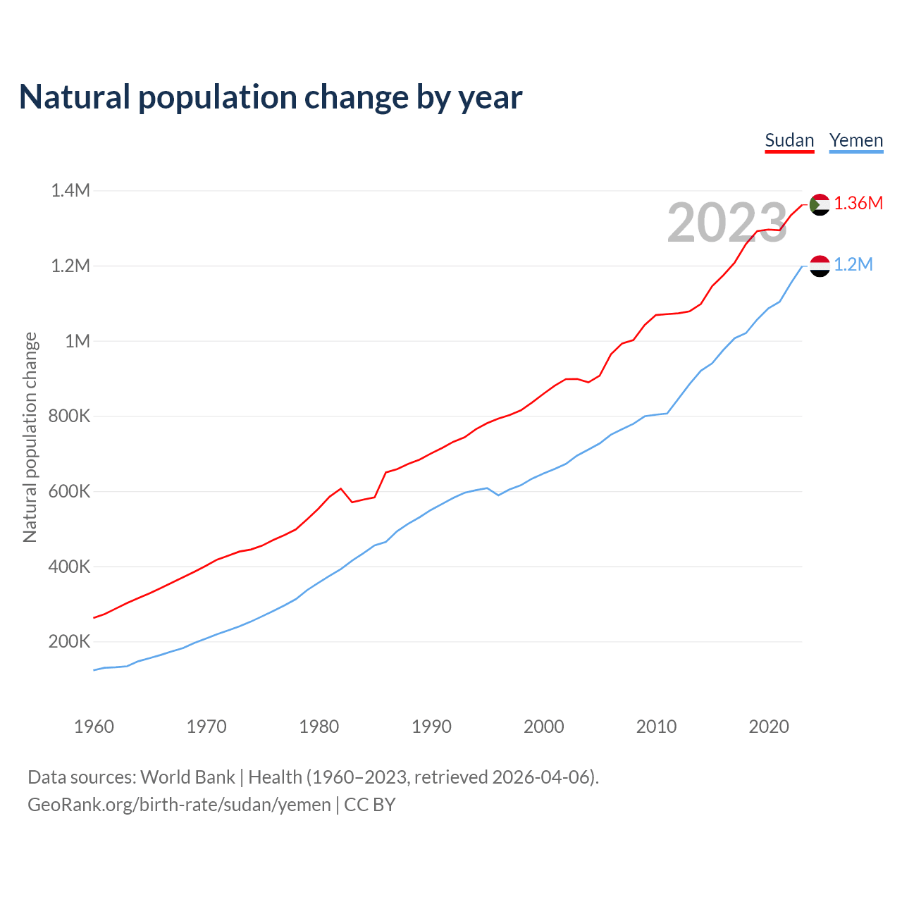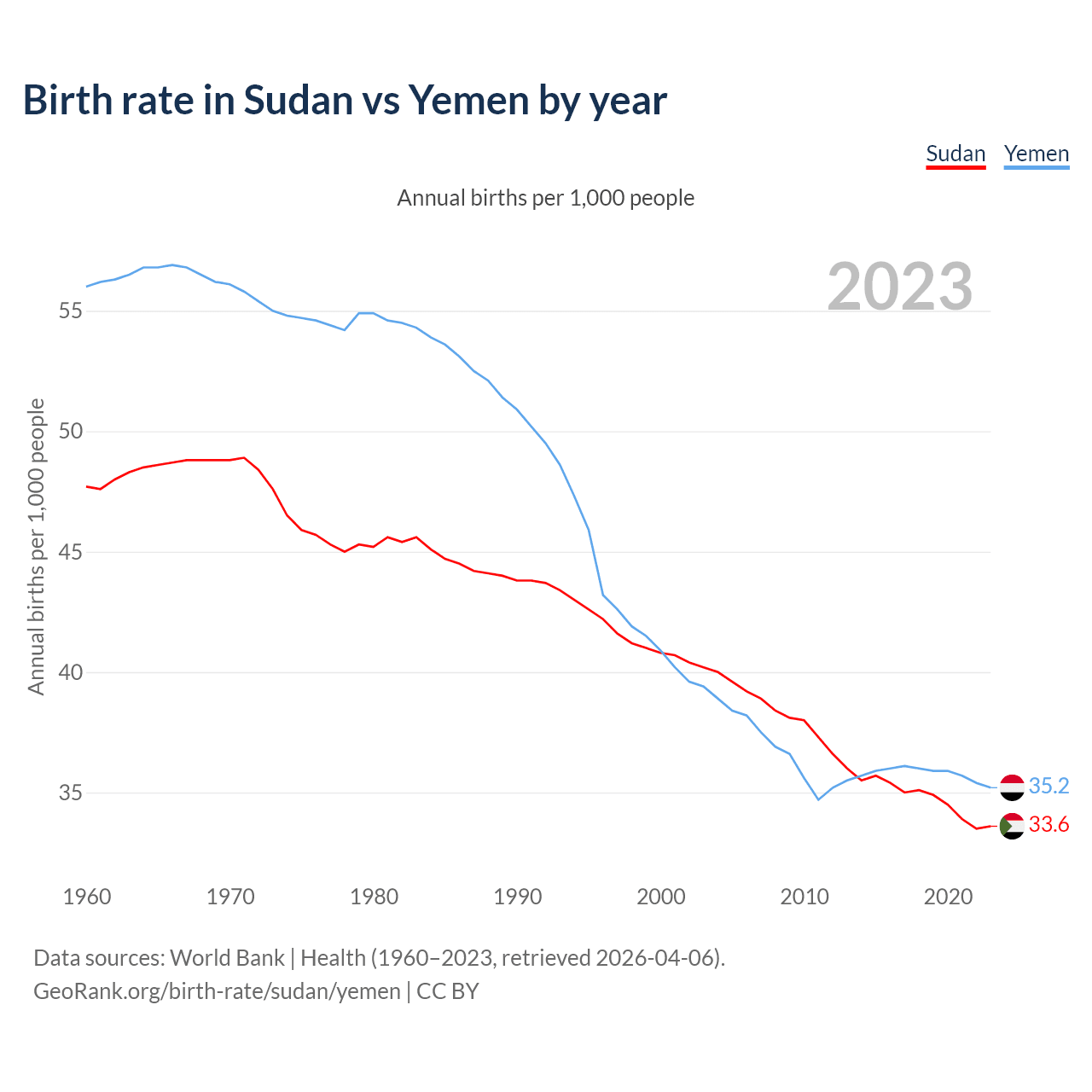 Sudan has an annual birth rate of 33.6 births per 1,000 people, compared to 35.2 for Yemen. The average number of children a woman is expected to have during her lifetime — the fertility rate, is 4.32 in Sudan and 4.59 in Yemen — 6.18% difference.