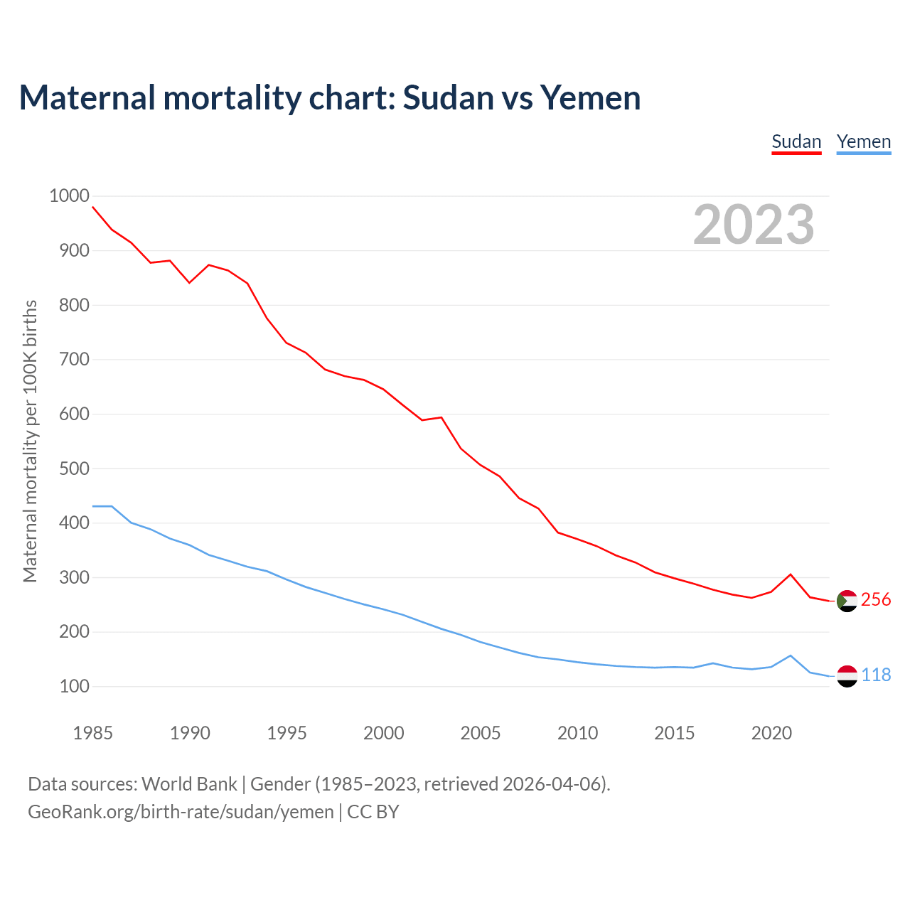 The maternal mortality rate, which is the probability of dying during childbirth or within 42 days of pregnancy termination, is 256 deaths per 100,000 live births in Sudan, compared to 118 deaths in Yemen.