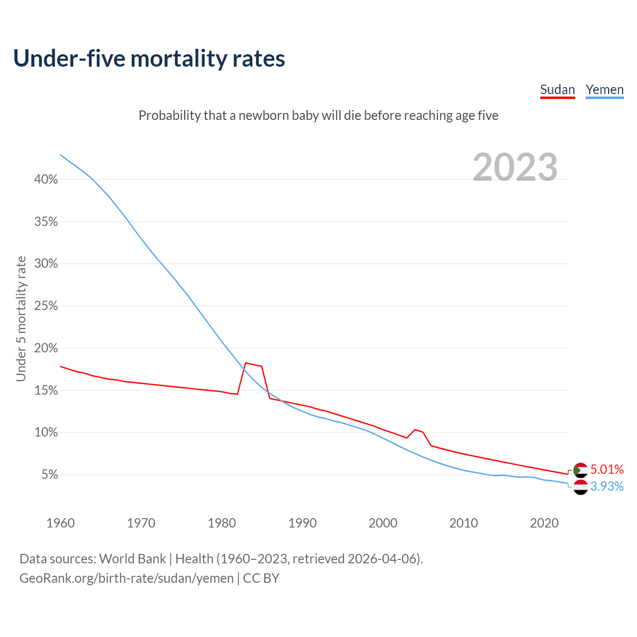The chance that a newborn baby will die before reaching age five is 5.01% in Sudan and 3.93% in Yemen. Above is a chart with historical data on under-five mortality rates.