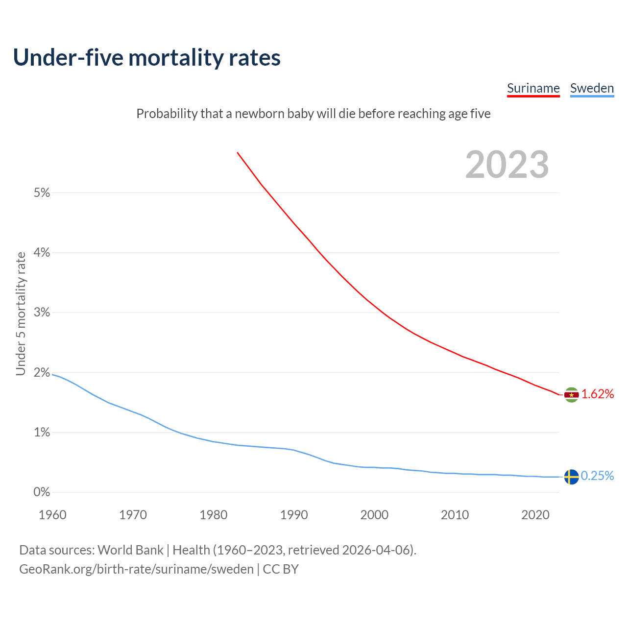 The chance that a newborn baby will die before reaching age five is 1.62% in Suriname and 0.25% in Sweden. Above is a chart with historical data on under-five mortality rates.