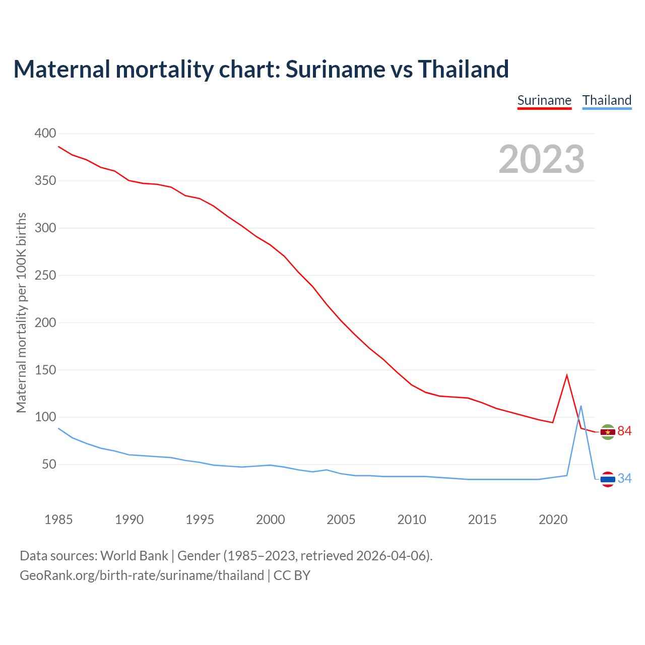 The maternal mortality rate, which is the probability of dying during childbirth or within 42 days of pregnancy termination, is 84 deaths per 100,000 live births in Suriname, compared to 34 deaths in Thailand.