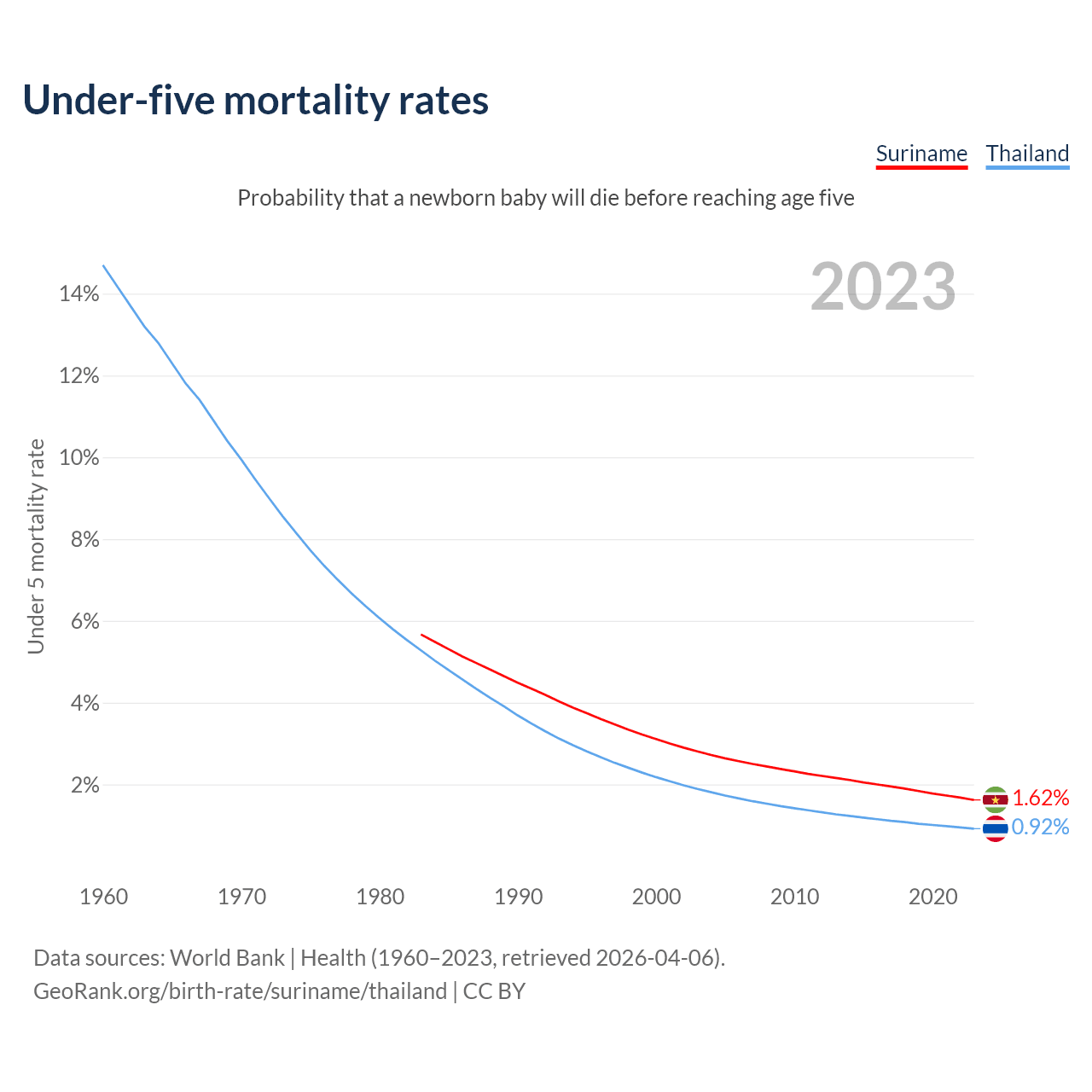 The chance that a newborn baby will die before reaching age five is 1.62% in Suriname and 0.92% in Thailand. Above is a chart with historical data on under-five mortality rates.
