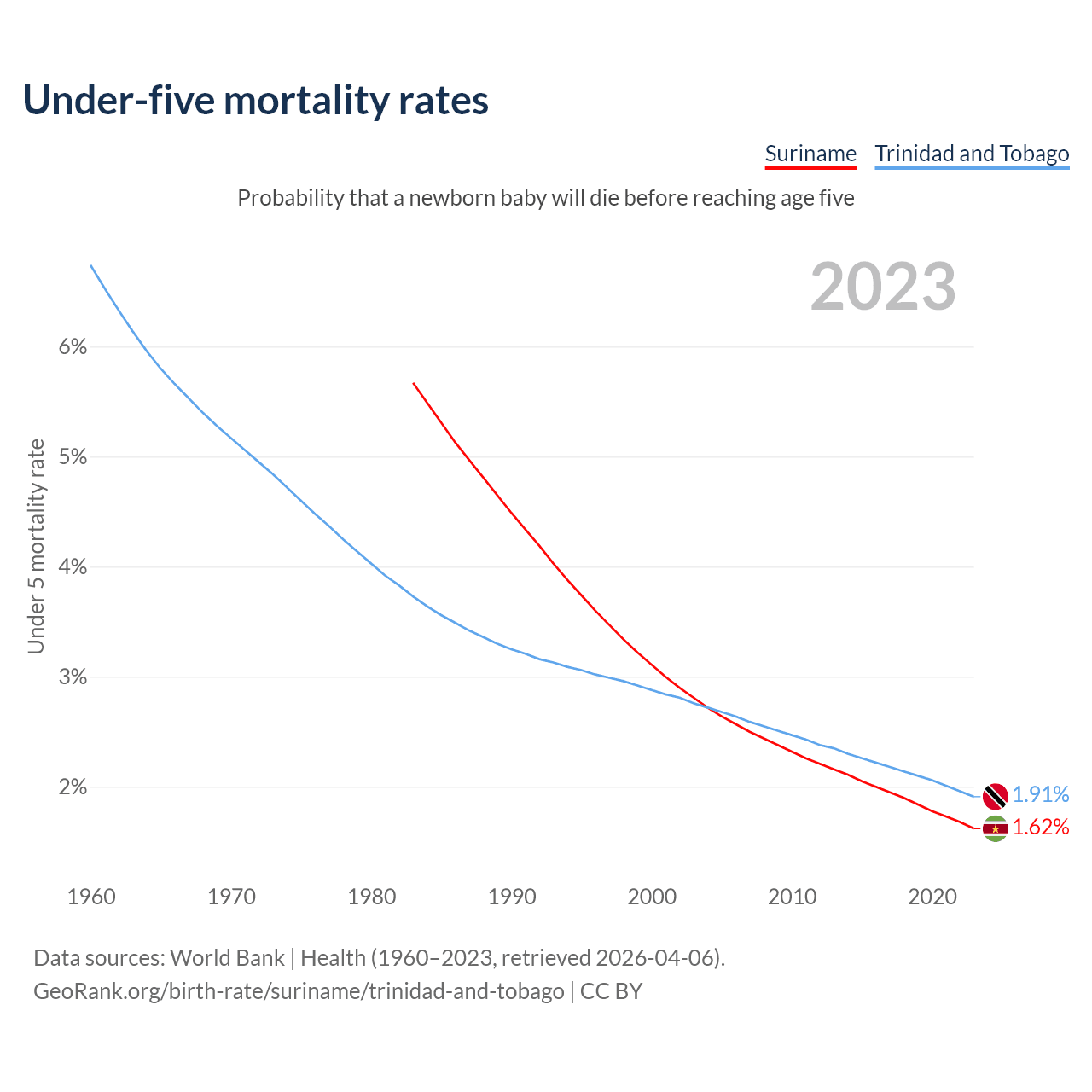The chance that a newborn baby will die before reaching age five is 1.62% in Suriname and 1.91% in Trinidad and Tobago. Above is a chart with historical data on under-five mortality rates.