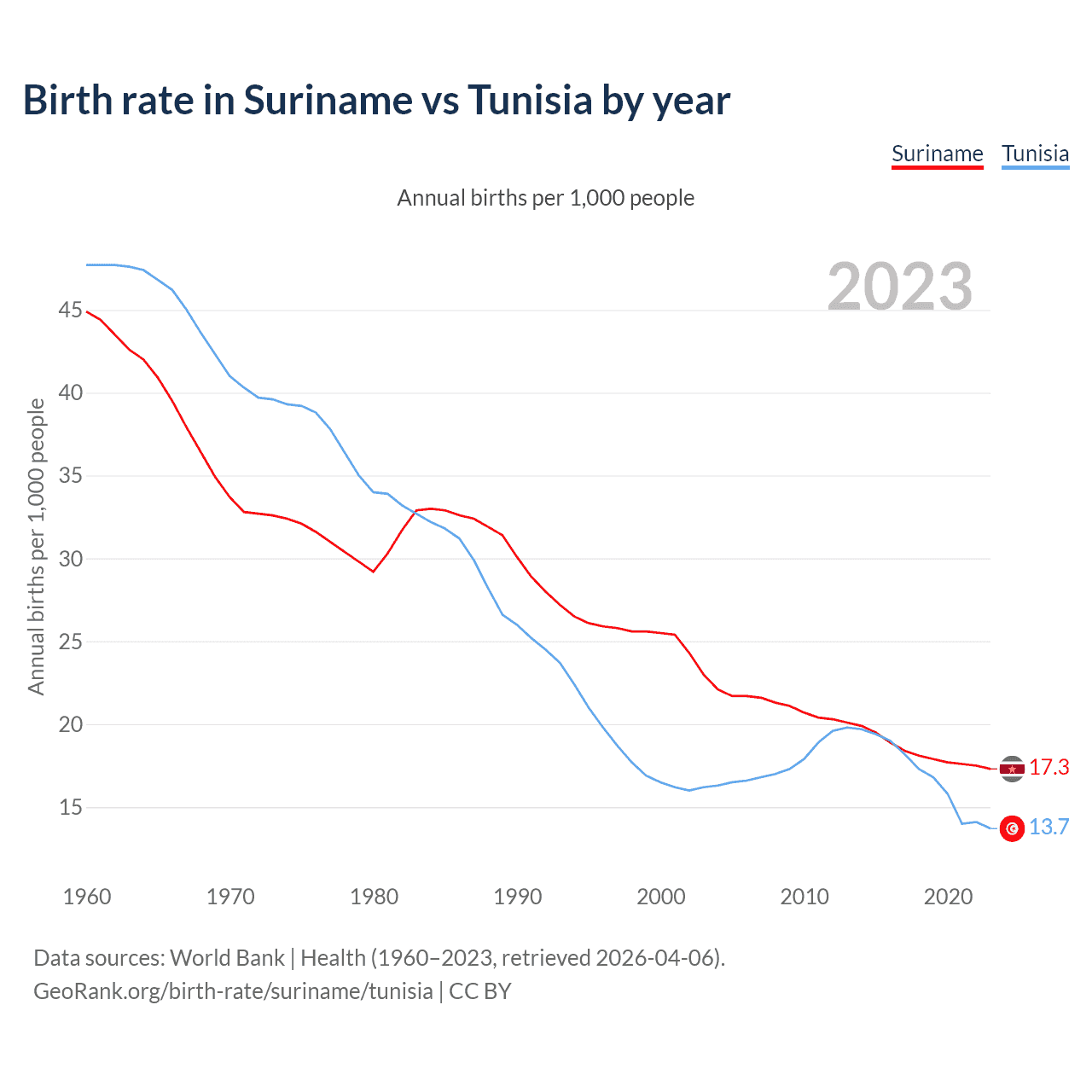 Suriname has an annual birth rate of 17.3 births per 1,000 people, compared to 13.7 for Tunisia. The average number of children a woman is expected to have during her lifetime — the fertility rate, is 2.25 in Suriname and 1.83 in Tunisia — 18.5% difference.