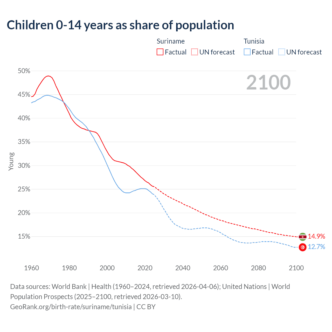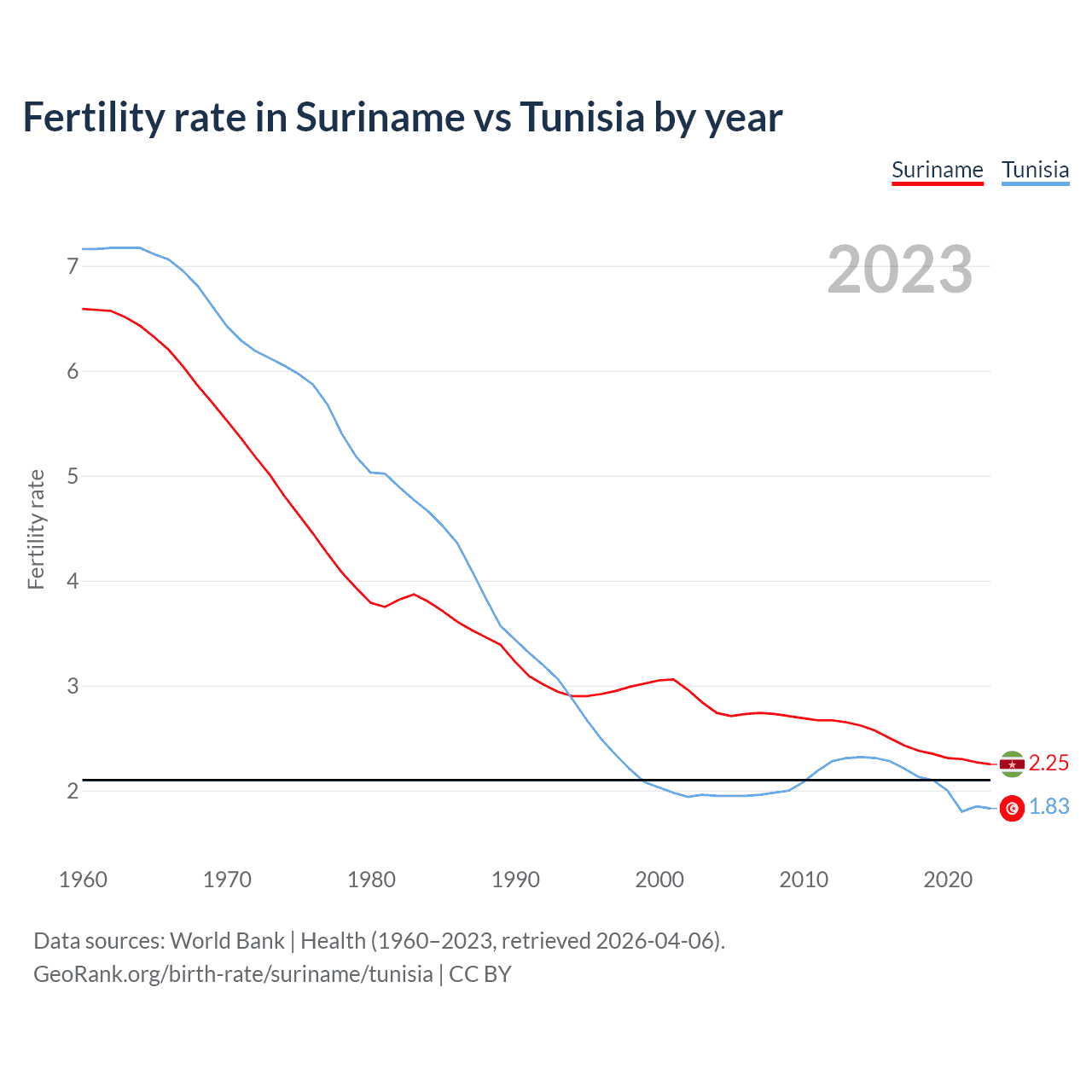 According to the latest available data on birth rates, the fertility rate in Suriname was 2.25 children per woman in 2023, compared to 1.83 in Tunisia in 2023. The replacement level is considered to be 2.1 children per woman.