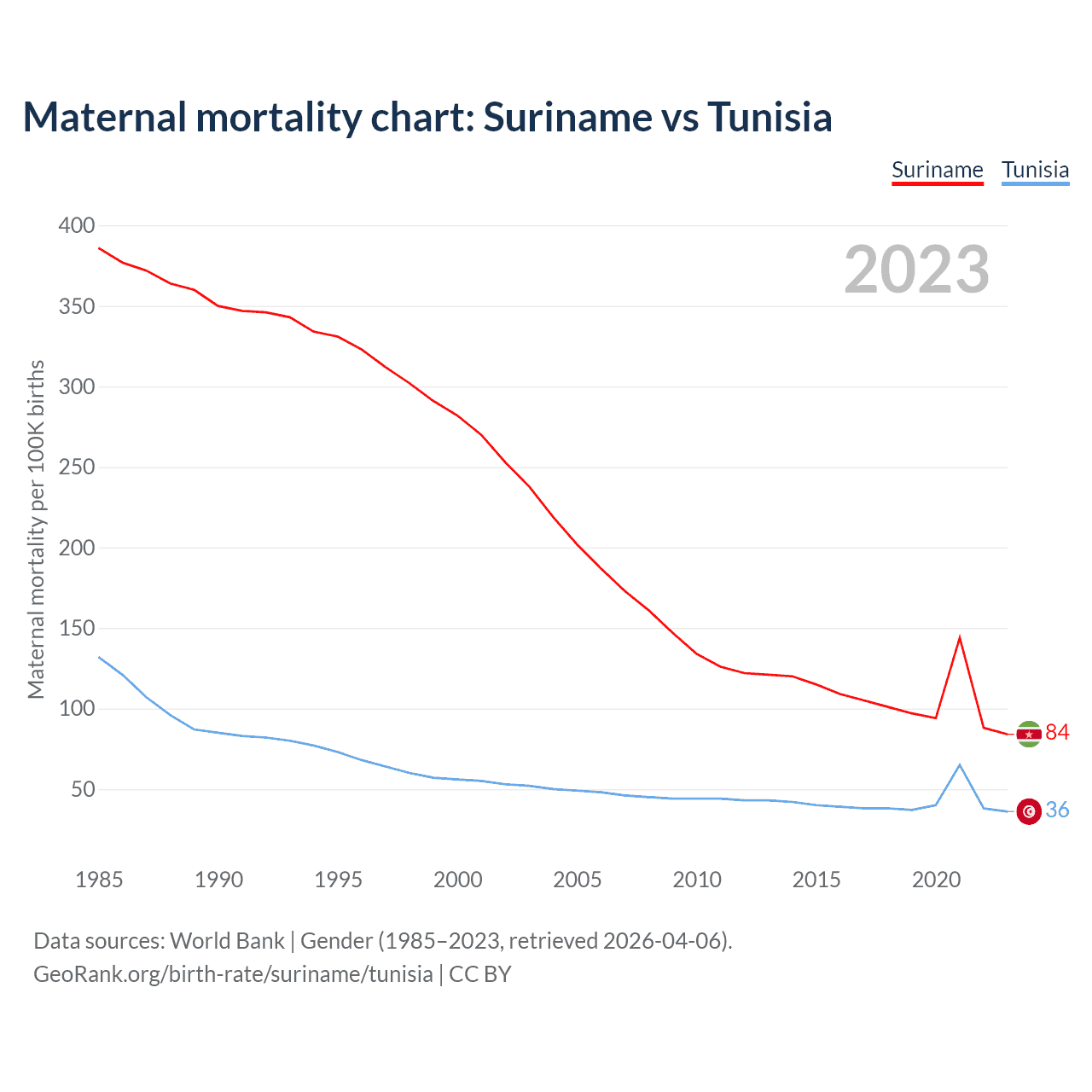 The maternal mortality rate, which is the probability of dying during childbirth or within 42 days of pregnancy termination, is 84 deaths per 100,000 live births in Suriname, compared to 36 deaths in Tunisia.