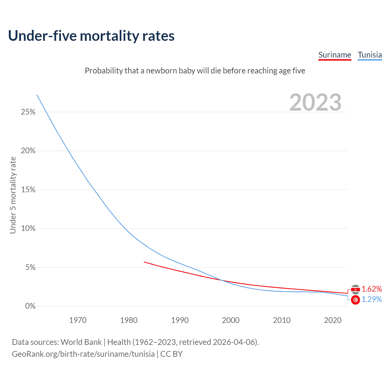 The chance that a newborn baby will die before reaching age five is 1.62% in Suriname and 1.29% in Tunisia. Above is a chart with historical data on under-five mortality rates.