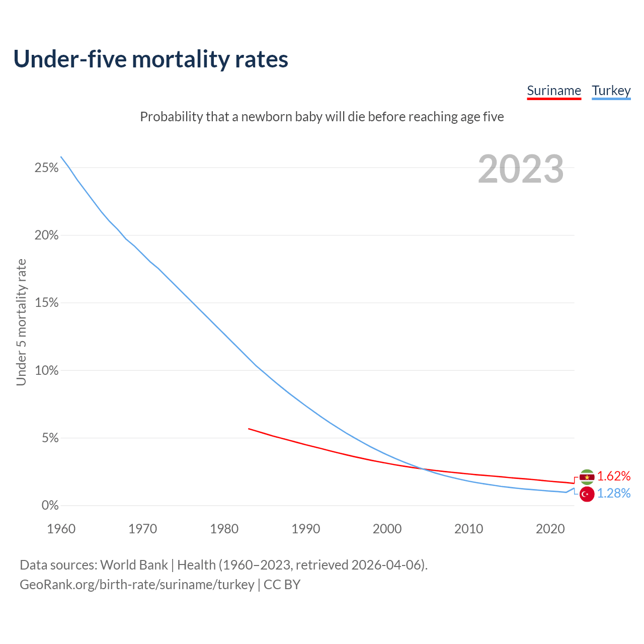 The chance that a newborn baby will die before reaching age five is 1.62% in Suriname and 1.28% in Turkey. Above is a chart with historical data on under-five mortality rates.